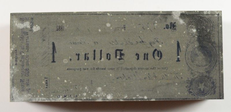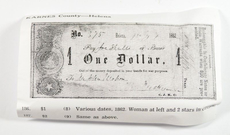 KARNES COUNTY ( HELENA ) BEARER NOTE , HAS PHOTO OF NOTE PRODUCED AND ORIGINAL PRINTING BLOCK, USED TO PRODUCE CONFEDERATE COUNTY NOTES AND PRIVATE SCRIPT REFERENCE GUIDE , ESTIMATE, $300.00 TO $325.00