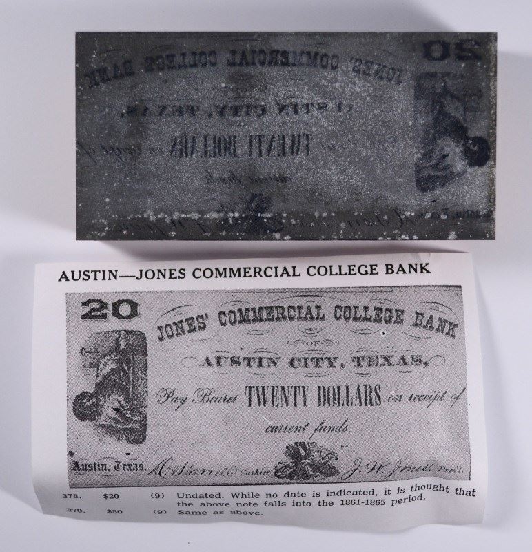 JONES COMMERCIAL COLLEGE BANK ( AUSTIN ), HAS PHOTO OF NOTE PRODUCED AND ORIGINAL PRINTING BLOCK, USED TO PRODUCE CONFEDERATE COUNTY NOTES AND PRIVATE SCRIPT REFERENCE GUIDE , ESTIMATE, $300.00 TO $325.00