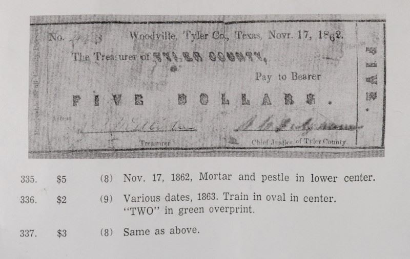 TYLER COUNTY TREASURER NOTE , HAS PHOTO OF NOTE PRODUCED AND ORIGINAL PRINTING BLOCK, USED TO PRODUCE CONFEDERATE COUNTY NOTES AND PRIVATE SCRIPT REFERENCE GUIDE , ESTIMATE, $300.00 TO $325.00