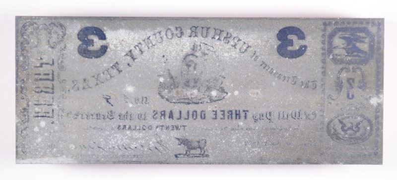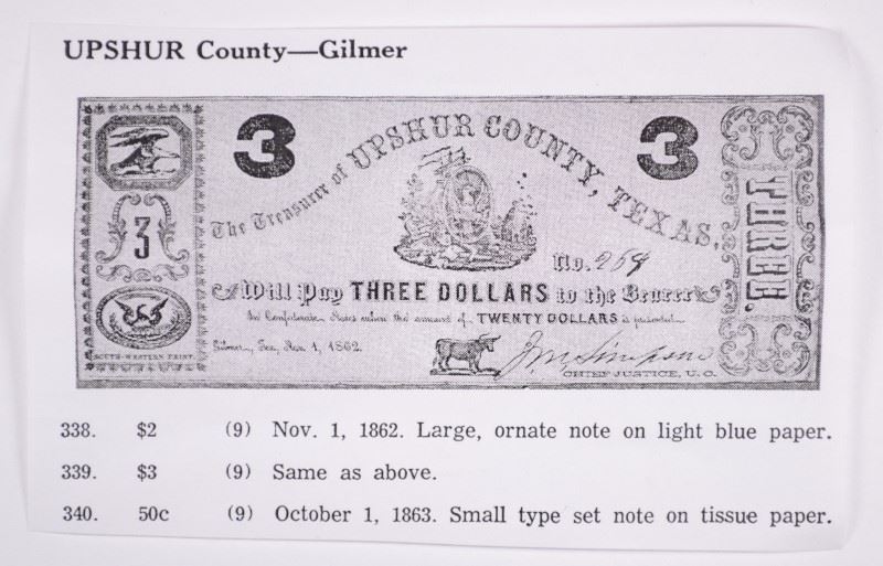 UPSHUR COUNTY TREASURY NOTE, HAS PHOTO OF NOTE PRODUCED AND ORIGINAL PRINTING BLOCK, USED TO PRODUCE CONFEDERATE COUNTY NOTES AND PRIVATE SCRIPT REFERENCE GUIDE , ESTIMATE, $300.00 TO $325.00