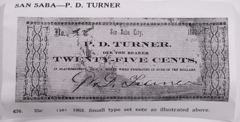 SAN SABO ( P.D. TURNER ) BEARER NOTE , HAS PHOTO OF NOTE PRODUCED AND ORIGINAL PRINTING BLOCK, USED TO PRODUCE CONFEDERATE COUNTY NOTES AND PRIVATE SCRIPT REFERENCE GUIDE , ESTIMATE, $300.00 TO $325.00