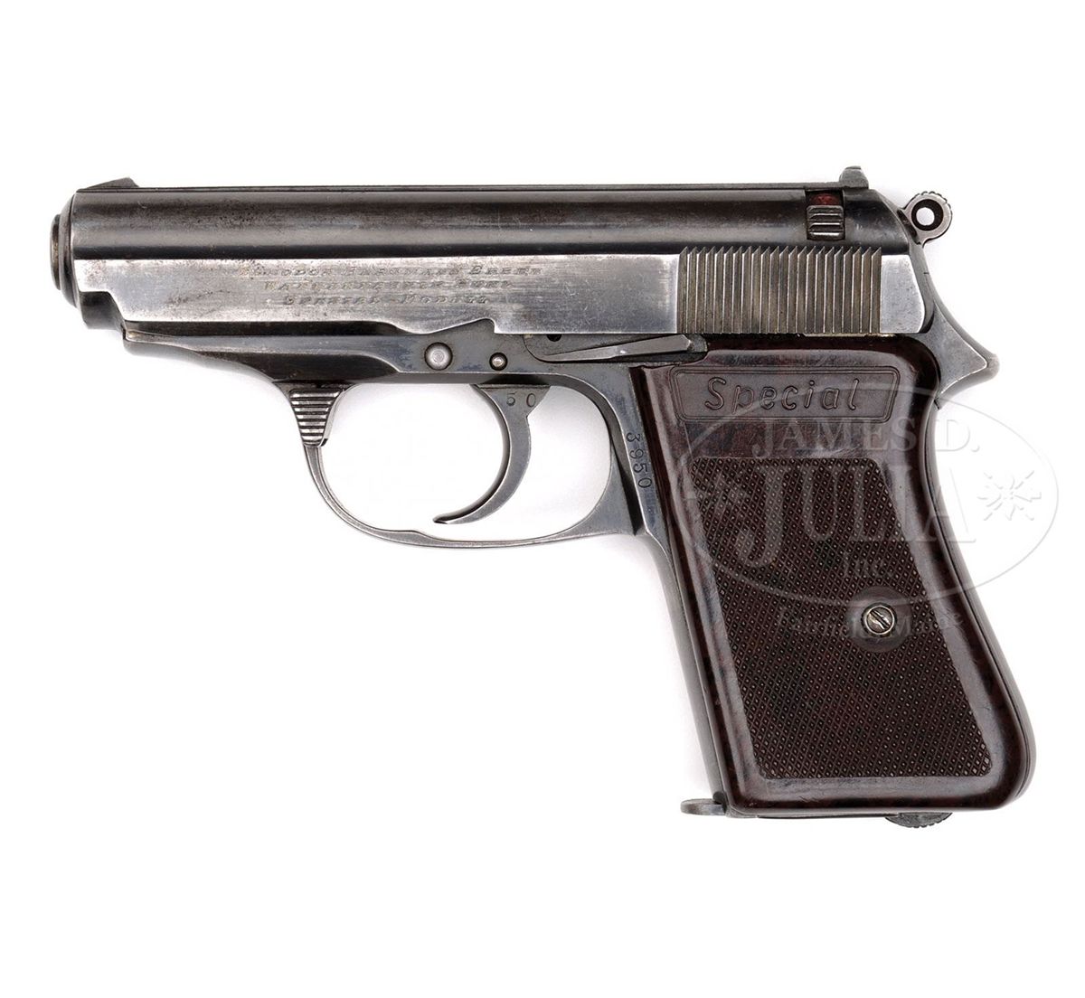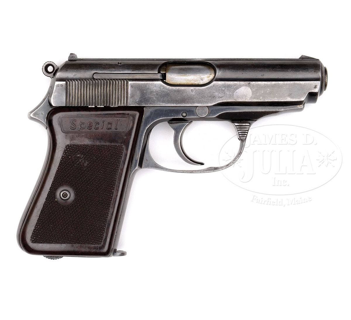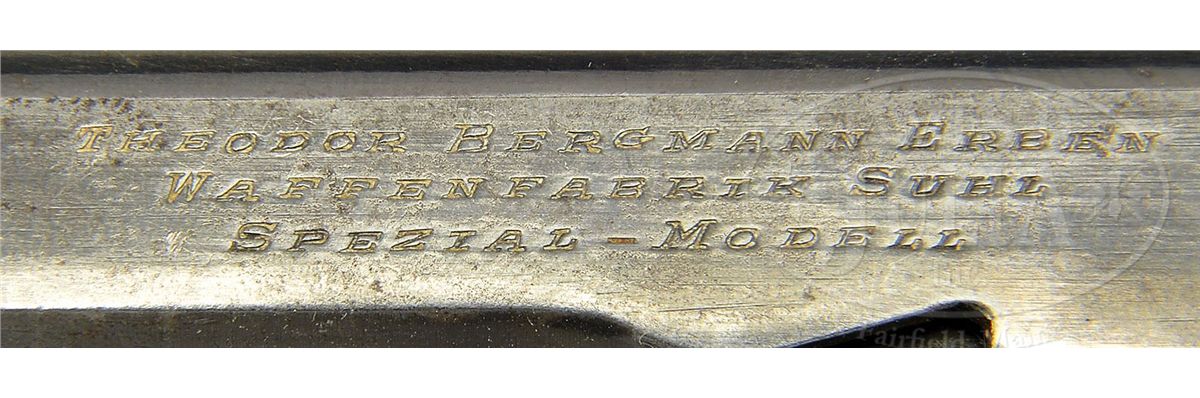 SN 3950. After transitioning through the numbered Bergmanns, the M1903 Bergmann Mars, and the series of M1910 and M1910/21s, Bergmann went on to manufacture a small number of pocket pistols in the 1930s, with various slide legends, reminiscent of the Walther PP/PPK. This Bergmann Spezial-Modell has a fixed front and integral rear sight in a slide 5.5" long that encases a bbl 3-3/8" long. The left side of the slide is marked with a three line address that reads "Theodor Bergmann Urben/Waffenfabrik Suhl/Spezial-Modell". Near the back of the slide on the left side, near the sight, is a two position safety. Rotating the safety up blocks the firing pin and exposes a green safety dot; rotating the safety down exposes a red dot, permitting firing. The serial number is marked on the left side of the frame, just forward of the single piece grip. Crown N proofing is on the right tang. The pistol can be fired either single action or in a modified double action mode. Pulling the trigger once cocks the hammer; pulling it a second time releases the hammer to fire. To disassemble, the serrated projection inside the forward trigger guard is rotated down. The slide may now be pulled back and rotated up and off the bbl, just like a Walther PP/PPK. Disassembled viewing shows a matching serial number inside the slide, on the left side of the bbl hood, in addition to the externally marked trigger and frame. The pistol has been fit with two piece phenolic grips, each checkered panel marked "Special" within a recessed border near its upper surface. The magazine is correct for this Bergmann pistol with two slotted indicator holes on the right side and a folded base to secure a floorplate with two positioning detents. PROVENANCE: Joseph J. Schroeder, Jr. Collection. CONDITION: This gun has sharp edge wear with thinning over most of its surface. Original blue coverage about 30-40% with patina but no significant pitting. Grips are in better condition with sharp checkering though the left panel is missing a chip in the upper left corner. The grip screw is marred. Very good condition magazine retaining most of its blue on the base. Bright bore with strong rifling and only minimal frosting. Perfect manual function. An exceedingly scarce semiautomatic pistol that is seldom offered for sale. 4-48530 LMA68