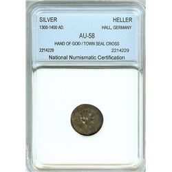 HALL, GERMANY 1300-1400 A.D. SILVER HELLER -HAND OF GOD- NNC AU58