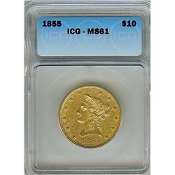 1855 LIBERTY HEAD $10 GOLD EAGLE ICG MS61 VERY RARE!!
