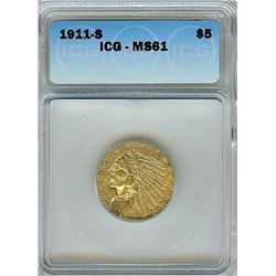 1911-S INDIAN HEAD $5 GOLD HALF EAGLE ICG MS61 SCARCE IN MINT STATE!