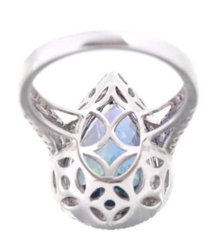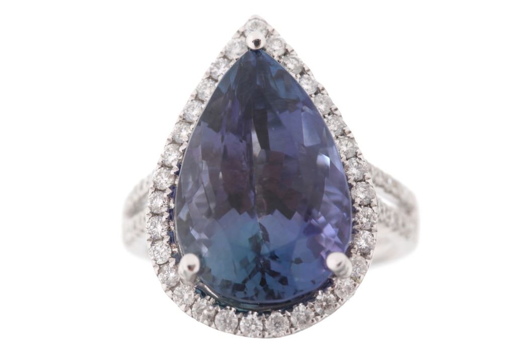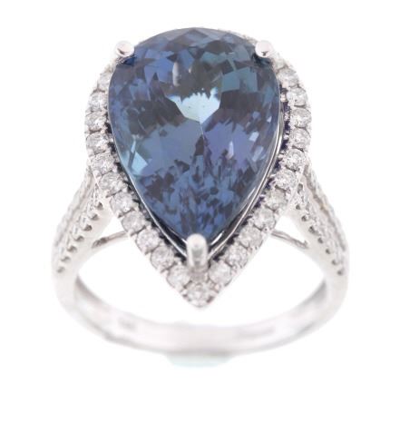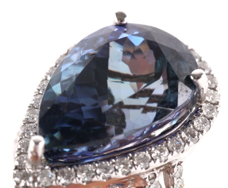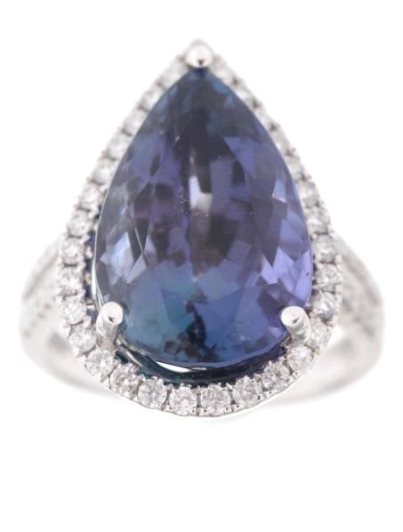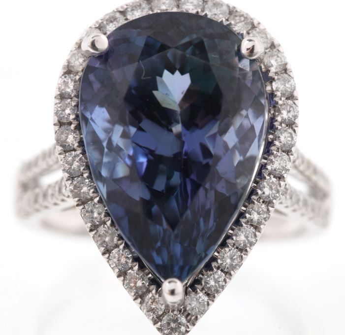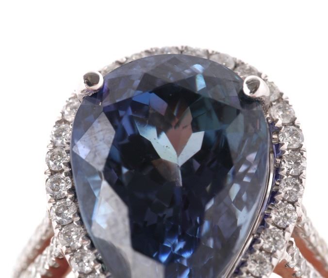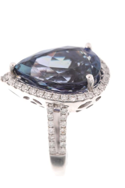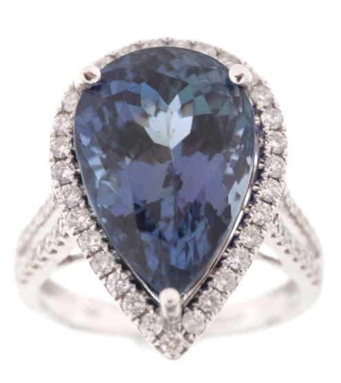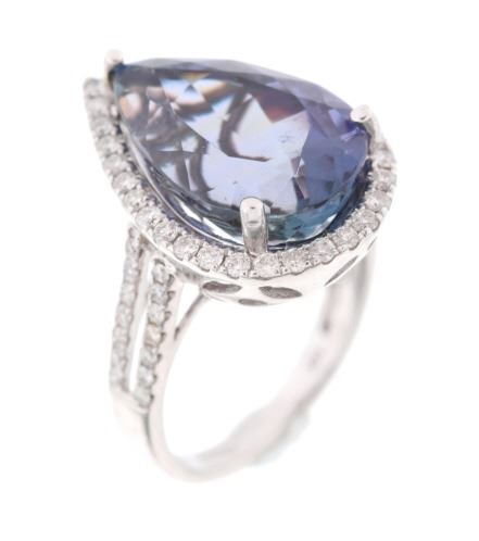 This is an exceptional natural 11.98 carat Tanzanite and Diamond 14K white gold Ring with GIA and AIG paperwork. Tanzanite Is a very rare precious gemstone that is only found in the Usumburu Mountains that border the Umba Valley of northern Tanzania. Originally discovered in 1967 by Tiffany & Company who named the stone Tanzanite. This example is unique due to its exceptional pleochroism (an optical phenomenon in which a stone has different colors when observed at different angles). The ring is from renowned designer Orianne Collins and is marked, "ORIANNE 14K”. The solid 14 karat white gold ring features a pear cut natural Tanzanite with brilliant cut crown and modified brilliant cut pavilion showing a total weight of 11.98 carats, excellent Violetish-Blue deep coloring and fine clarity. The ring comes with a GIA (Gemological Institute of America) which confirms the above info and states that it is an authentic natural Tanzanite stone (GIA paperwork is considered the gold standing in Jewelry). The piece also comes with an AIG (American International Gemologists) report and appraisal which values the ring at $38,000.00. The ring shows a size of 7 US.