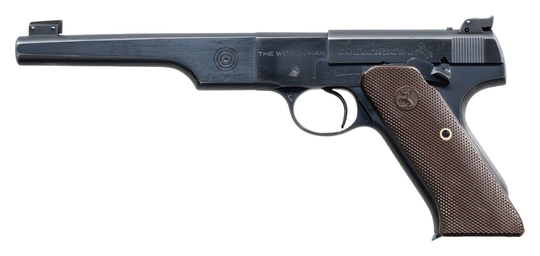 TARGET WITH FACTORY LETTER. Cal. 22. S# MT13899. Bbl. 6 5/8". 1 of only approx. 4,000 First Series Woodsman Match Target semi-automatic pistols mfg. by Colt sold to the U.S. Army & Navy during WWII. The left side of the slide bbl. is marked "MATCH/ (BULLSEYE)/ TARGET, with Colt's mfg. and patent information marked across the top. The left side of the frame is marked "THE WOODSMAN" above a U.S. crossed cannons proof marked, with typical factory markings present on the left side of the slide. Right side of the frame is marked with a U.S. "G.H.D." (Guy H. Drewry) inspection proof. Metal components exhibit a blue finish overall, with the top strap of the bbl. and slide, as well as the rear of the slide and upper frame exhibiting a matte blue finish. Frame is mounted with 2-piece elongated Colt checkered brown plastic grips. Pinned Patridge blade front sight, with dovetailed adj. square notch rear sight. MAGS: 1 blued 10-rd. marked "COLT WOODSMAN/ CAL. 22 L.R./ MATCH TARGET MOD." on the floorplate. UNATTACHED ACCESSORIES: Colt factory letter indicating that this example was shipped to "United States Goverment/ Officer in Charge/ Naval Supply Depot/ Norfolk, VA" on September 14th of 1943 in a shipment of 525 same type pistols. Pistol is also accompanied by a reproduction military style cardboard box. CONDITION: metal components retain the majority of their original blue finish, showing light to mild edge wear, some superficial marks and scratches, as well as some scattered spots of light pitting on the right side of the frame, slide, and bbl. Mirror bore, retaining well defined rifling throughout. Proper manual mechanics. Grips are excellent. Reproduction box is excellent overall. A nice example of a rare U.S. military marked First Series Colt Woodsman Match Target pistol. (25-4312/MLW). CURIO. $2,500-3,000.