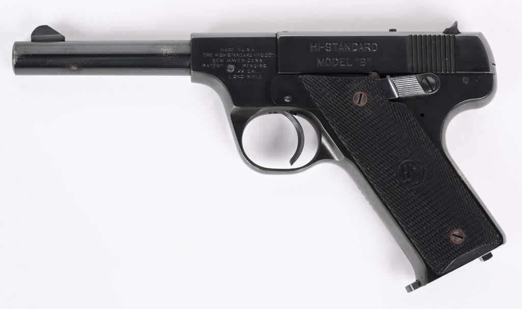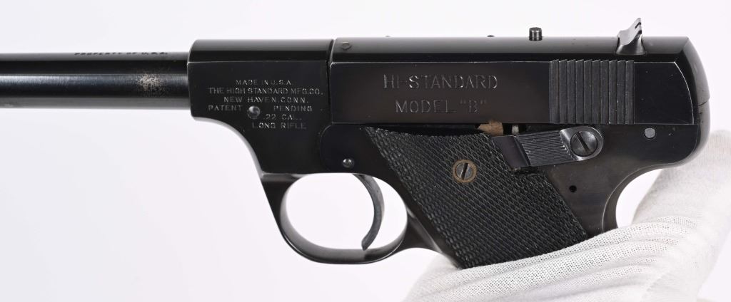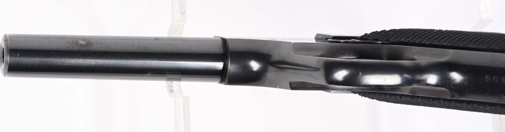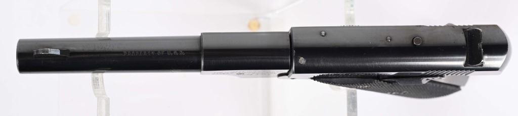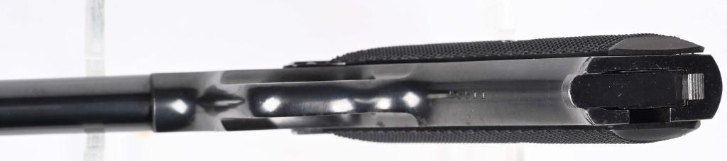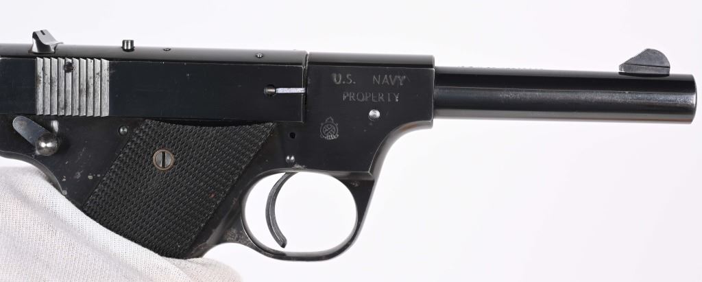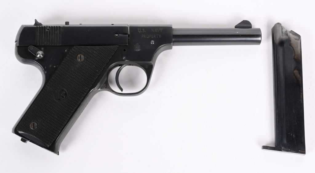 SERIAL NUMBER: 50511. BARREL: 4-1/2". CALIBER: .22LR. MANUFACTURED: 1939. Purchased by the government to familiarize recruits with handgun shooting and marksmanship. Standard factory and model markings throughout, with the addition to "U.S. NAVY/PROPERTY" marked on the right side of the chamber area. Under that, is a crossed cannons ordnance cartouche. Top of the barrel is marked "PROPERTY OF U.S.A.". Standard blade front sight and u-notch rear. Original blued finish and checkered plastic grips. Includes a factory two tone blued steel magazine. CONDITION: Metal is excellent, with some light holster wear on the barrel. Grips are excellent. Bore is shiny with crisp rifling. Mechanically fine. Magazine has light wear. C&R