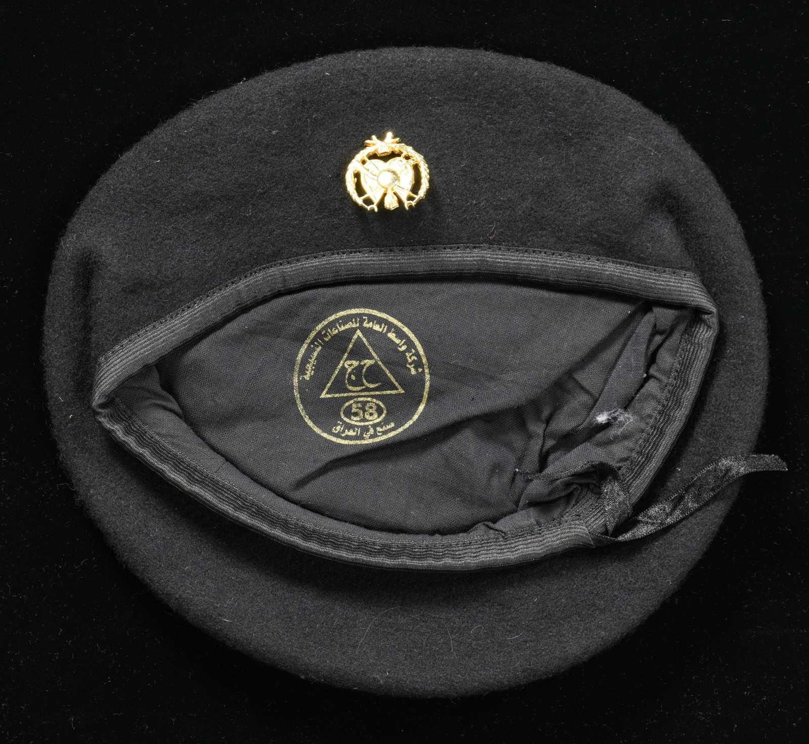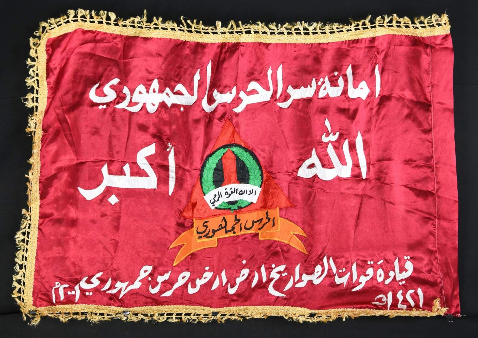 FORCES COMMAND" FLAG. 46" x 32" single applique, direct embroidered and panel sewn. Arabic translation of phrases is roughly: "Secretariat Republican Guards" "Only God is mightier than our missiles" "Ground to Ground Missile Command" along with Arabic date 1421 which is 2000. Accompanying flag is a black beret with Iraqi label and loose piece of insignia. CONDITION: very good to fine overall, but fraying at edge of sleeve hoist & silky fringe. (02-19473-73/JS). $200-300.