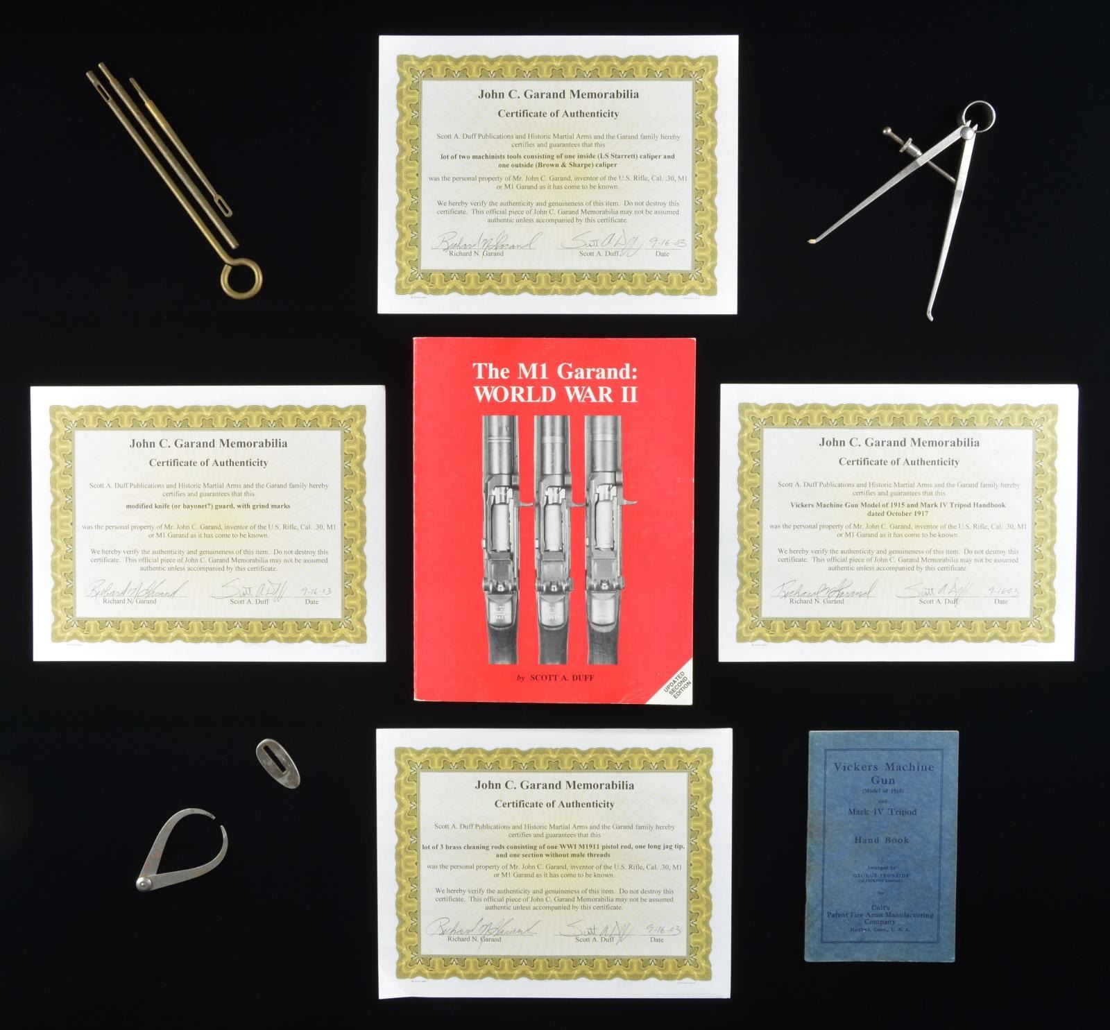 PERSONALLY OWNED BY JOHN C. GARAND, FAMED DESIGNER OF THE M1 GARAND RIFLE.. Articles acquired from Scott A. Duff, nationally known firearms authority & author, according to the sales receipt dated 9-17-2003. Pieces are accompanied by a copy of the sales receipt & Certificates of Authenticity signed by Richard N. Garand & Scott A. Duff dated 9-16-03. Richard N. Garand was the son of the late John C. Garand who while working at the Springfield Armory developed the famous M1 Garand military rifle used from WWII through the Vietnam era. 1) Machinist outside caliper approx. 3-1/4" long w/ friction joint. Caliper is marked “L.S. Starrett Co. Athol, Mass USA”. CONDITION: caliper is lightly worn from careful use w/ scattered scratches & spots of light oxidation. 2) Machinist inside caliper approx. 6-3/4" long by “Brown & Sharpe, Providence RI”. CONDITION: Caliper appears to have seen a good amount of careful use & has light wear & oxidation. (02-17437-1/RW). 3) Vickers Machine Gun Model of 1915 & Mark IV Tripod handbook published by Colt, Hartford, Conn. Copyright 1917. This pocket size handbook was a condensation of a larger volume & meant to be carried by a machine gunner. CONDITION: Blue paper covers. Handbook is legible but has light wear & staining. 4) Lot of 3 brass cleaning rods consisting of 1 WWI 1911 pistol rod, 1 long jag tip & 1 section w/o male threads. CONDITION: in good serviceable condition w/ appropriate patina. 5) 1 unfinished or modified crossguard for knife or bayonet. Crossguard measures approx. 1-3/4" by 13/16". Slot is 1" x 1/8". CONDITION: mill scale finish w/ file marks. 6) Copy of The M1 Garand World War II by Scott A. Duff, updated 2nd edition. Volume has light wear & staining. The group also includes as stated above 4 Certificates of Authenticity for the 2 machinist tools, the Machine Gun Handbook, the crossguard, & the cleaning rods. CONDITION: certificates are in very good condition. (02-17437-1/RW). $200-400.