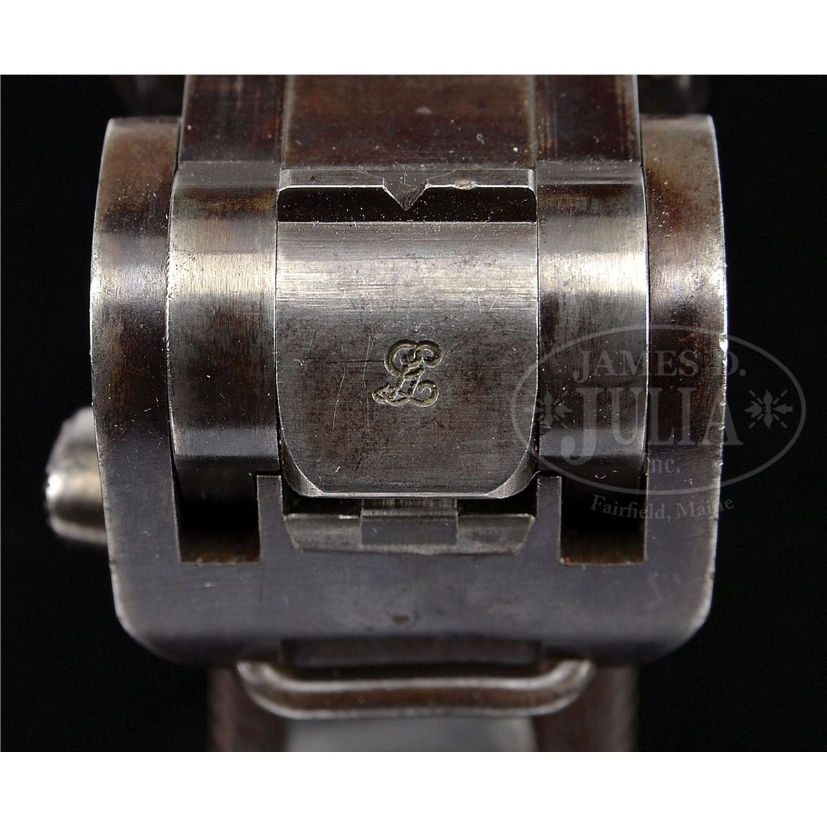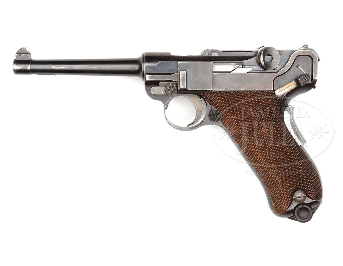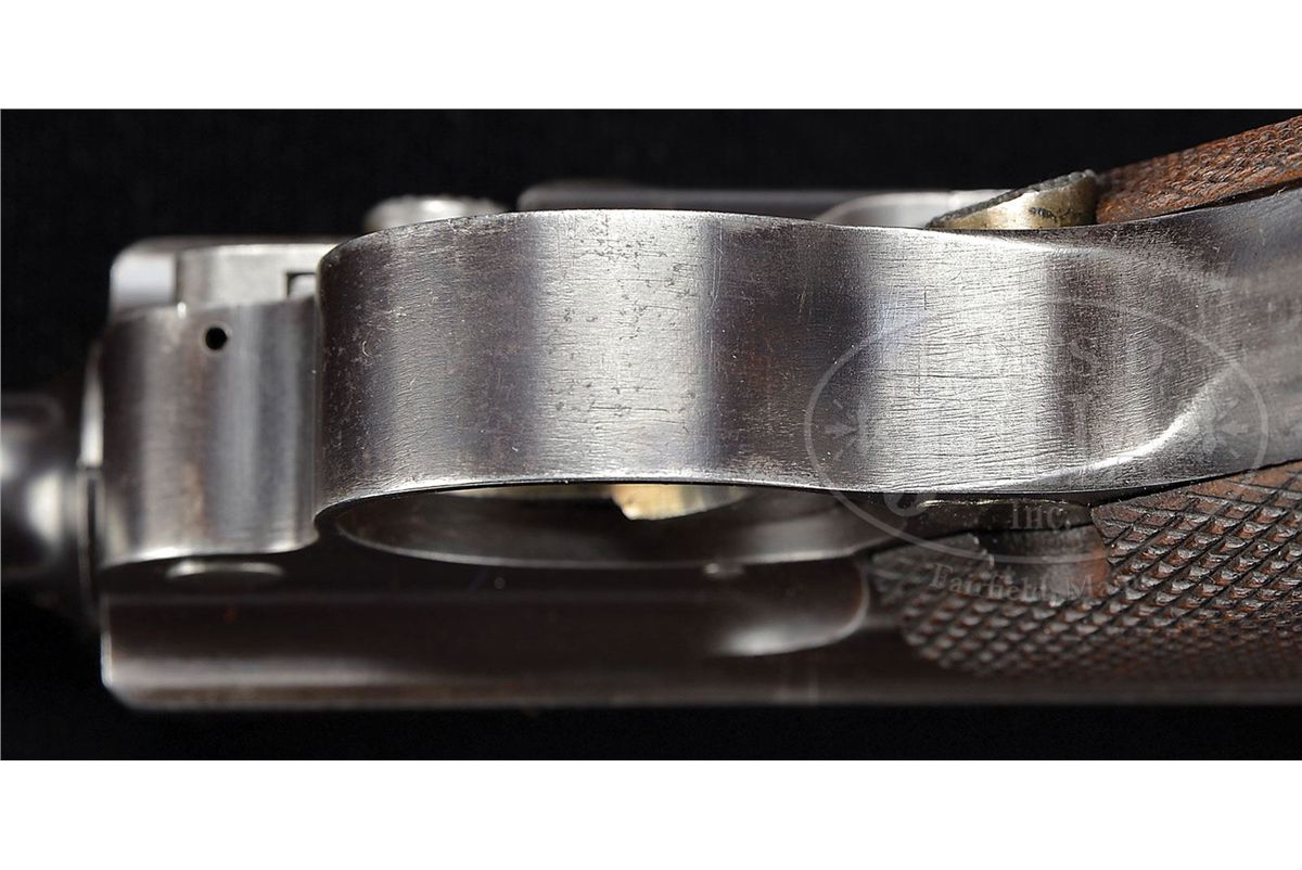 PLEASE NOTE (10-13-13): The catalog correctly states that there is no manufacturer’s serial number, manufacturer’s marks, etc. on this item. That is exactly how it is and written exactly as it should be. But also please be aware, per the diamond symbol next to the number, it clearly indicates that this item was imported as part of the Sturgess Collection and as such, by Federal Law is required to have an import mark. Import markings require all the pertinent information including a SN so the gun is import marked in the recess area near the clip insert. The catalog description is correct and the representation is correct. The catalog description states there are no manufacturer’s marks, which there are not and the diamond symbol indicates that it has the appropriate import marks which include the SN, etc. If there are any questions do not hesitate to contact us on this very rare gun. NSN. 4-3/4" 30 Cal. bbl. "DWM" scroll on center toggle link. Dished toggles. "GL" on rear toggle link. No other external markings or proof marks and no internal parts numbering. Grip safety. Plain wood bottom magazine. This gun is the same configuration as the 1900 US test guns, and this may have been a prototype for that series. This gun is featured on p. 283 of Dr. Geoffrey Sturgess' The Borchardt & Luger Automatic Pistols. PROVENANCE: Collection of Dr. Geoffrey Sturgess. CONDITION: Retains 80% orig blue and 40% orig straw. Bore is bright and sharp. Grips are lightly worn with some large indents on the right side. Magazine is very good with a dent in the body. Mechanics are very good, missing the original takedown lever spring. 4-52747 BWS85
