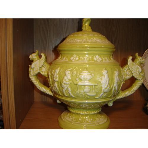 14 INCHES TALL AND IS YELLOW AND WHITE. VERY DIFFERENT DESIGN ON AT THE TOP IS A CAT, THE HANDLES ARE OF DRAGON AND ALL AROUND IT THERE ARE ELF LIKE MEN ON IT WITH A TABLE OF THE URN ON IT. AND FLOWERS ON THE BOTTOM AND TOP RIM.