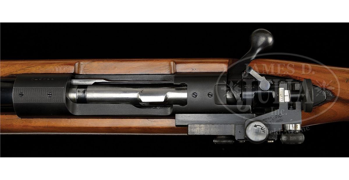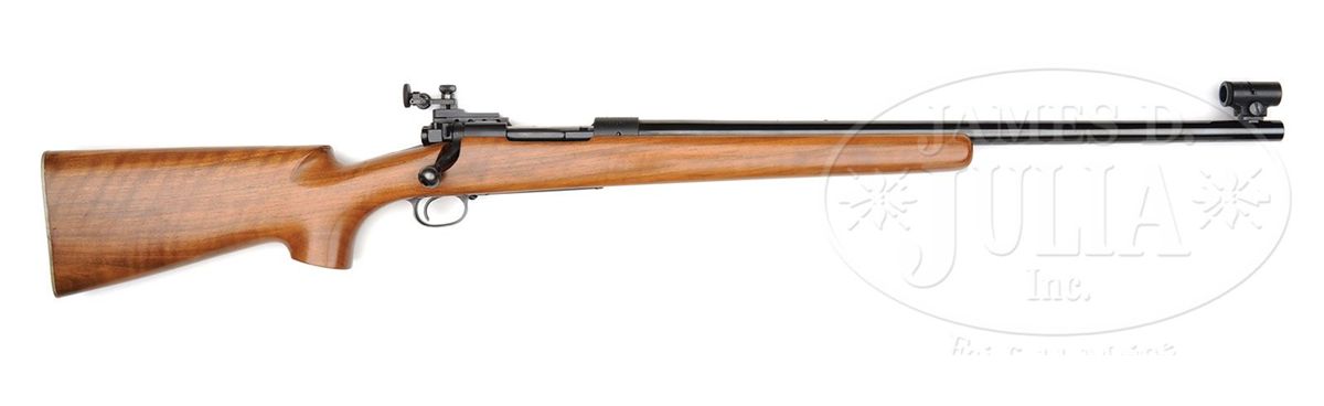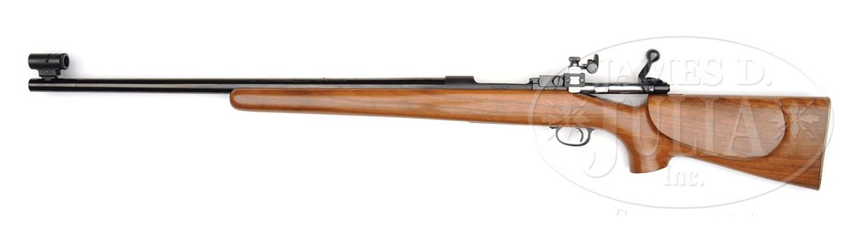 SN 338279. Cal. 30-06. Beautiful medium weight sniper with 24" tapered medium weight rnd bbl with Refield International match globe front sight and Redfield Olympic micrometer rear sight. Barrel has standard markings and is drilled and tapped for scope blocks. Mounted in a heavy, uncheckered, straight grain walnut stock with wide forearm and deep pistol grip with cheekpiece and checkered flat aluminum buttplate. Receiver has the unusual feature of a military style stripper slip slot in the bolt opening which is typical of the sniper rifles sold by the Evaluators Gun Shop in Triangle, Virginia, which is near the Quantico Marine Base. This shop was operated by retired Marine Corps Col George Van Orden. Colonel Van Orden was awarded the Navy Cross, the second highest military decoration for bravery during combat in the Pacific in WWII. During WWII, Colonel Van Orden lobbied the Marine Corp. to adopt the Model 70 as their sniper rifle. He was unsuccessful and the Marine Corps adopted the Springfield 1903A1 with Unertl 8X scope as their sniper rifle. Colonel Van Orden also served during the Korean War and when he learned that the Marine Corps was insufficiently supplied with sniper rifles, he purchased Model 70 rifles equipped with hunting scopes for issue to his snipers. Those rifles have standard weight bbls in heavy target stocks. After the war Colonel Van Orden opened his gun shop, identified above, and sold a number of these Model 70 rifles. This rifle is identified as one of the rifles sold through his shop and listed in Vol. I of Death From Afar, Chandler. A copy of that book is not available to this cataloger to identify the purchaser of this rifle. CONDITION: Exceptionally fine, all matching. Overall retains virtually all of its crisp, orig factory finish with bright blue on the bbl, floorplate and trigger guard and crisp satin finish on the receiver. Stock has a tiny chip back of the top tang and a short streak of oil stain, otherwise it retains about all of its crisp, bright, orig finish with only a few light mars in the varnish. Mechanics are crisp, brilliant shiny bore, may be unfired. 4-49221 JR294