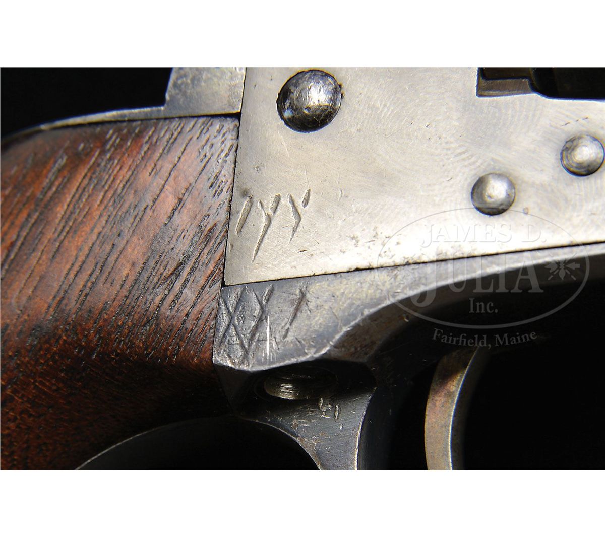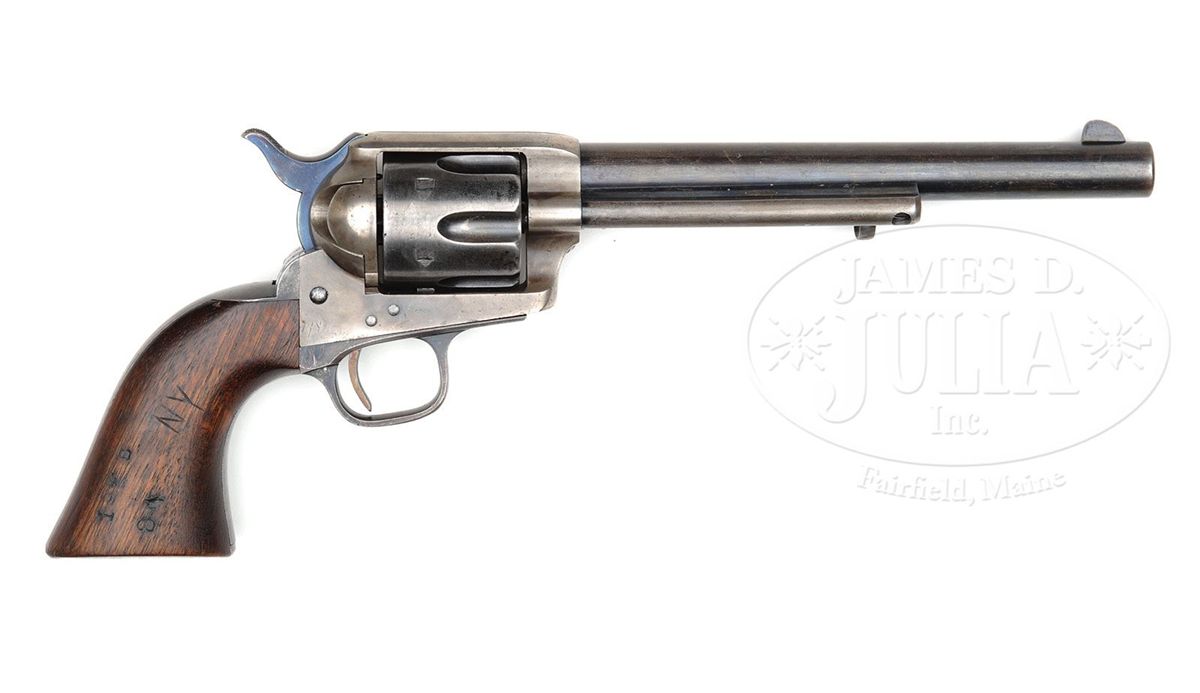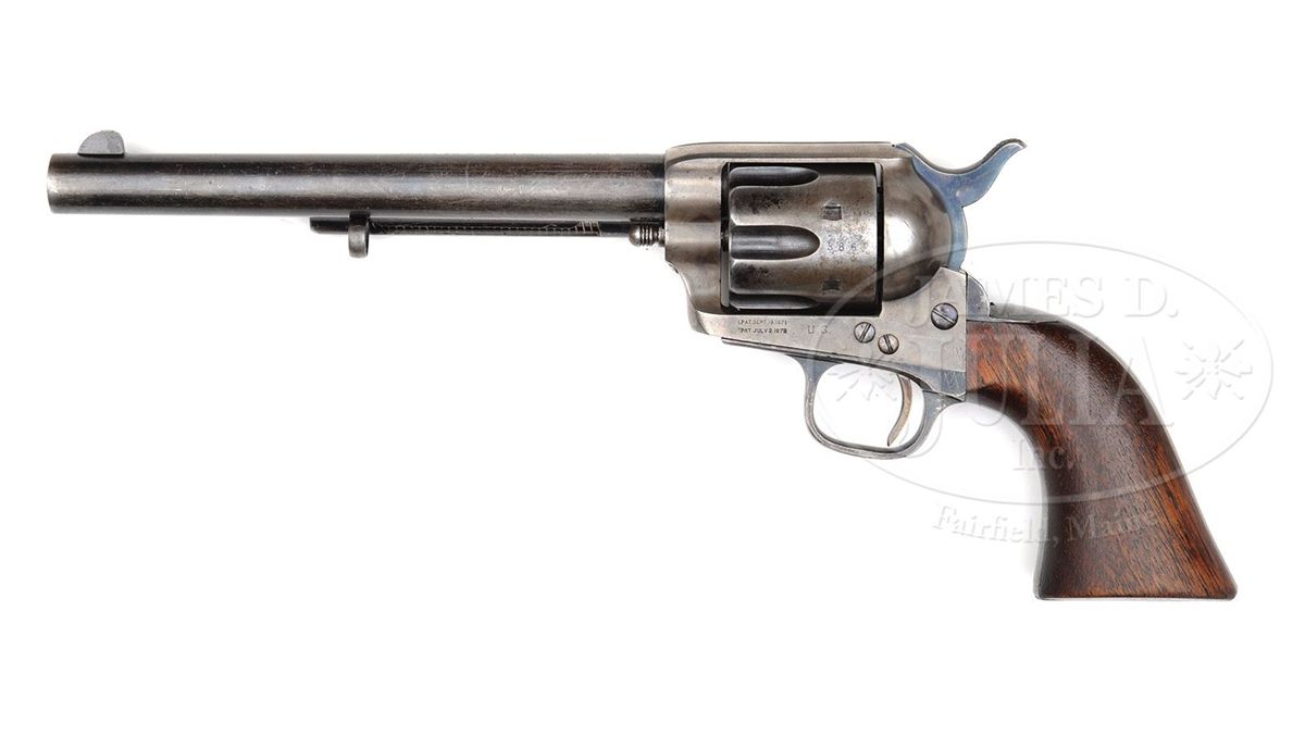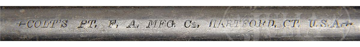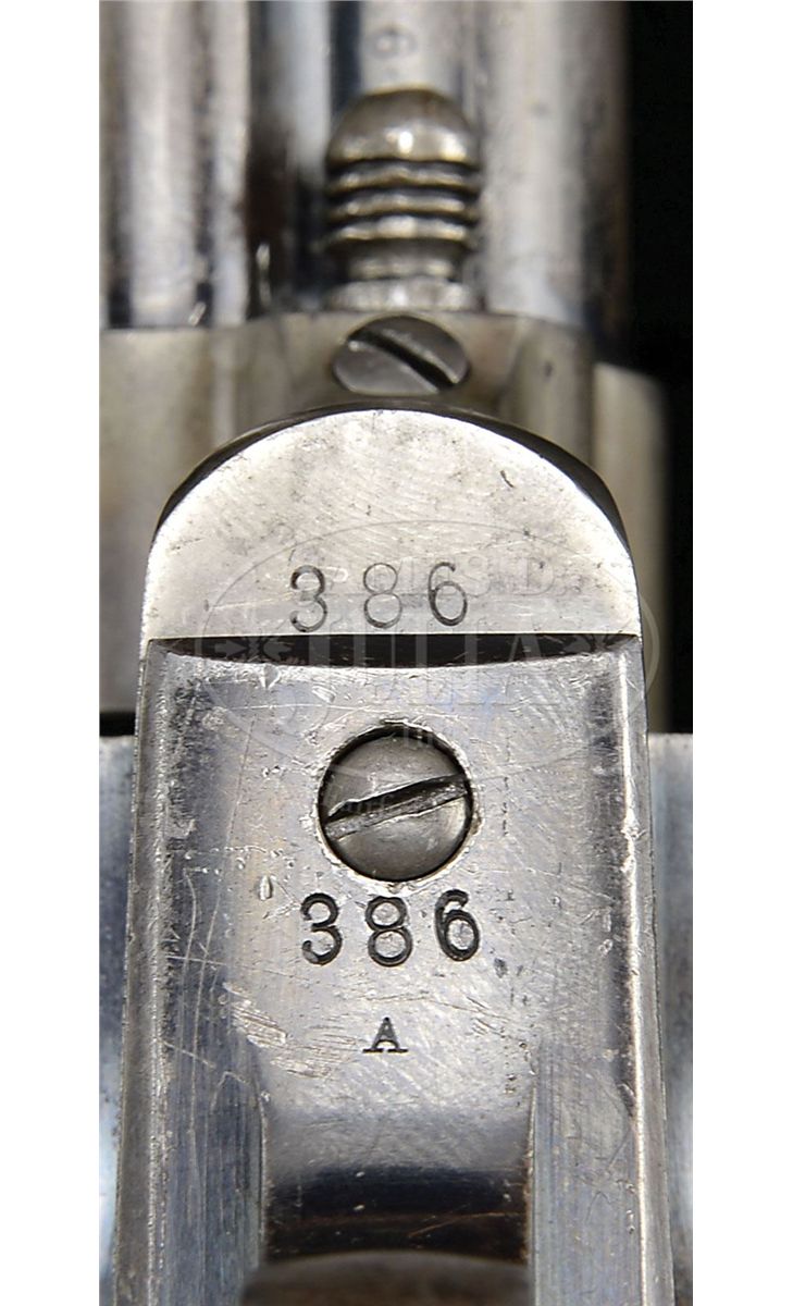 SN 386. Cal. 45 Colt. Blue & color case hardened with 7-1/2" bbl, full front sight and 1-line script address that has broken "O" in "Co" and broken "A" in "HARTFORD" with a broken tail in "C" in "CT". Left side of frame has 2-line, 2-patent dates and a small "U.S.". Ejector housing is first type with bull's eye ejector rod head and base pin is orig type with dimpled ends. Mounted with replacement 1-pc walnut grip that is marked "1 B" and "84" with a large "NY" (1st Battalion, rack #84). Bottom right of grip has "RAC" (Rinaldo A. Carr) sub-inspector initials and no visible cartouches. This indicates that this revolver was one of the 800 Cavalry revolvers recalled and refurbished by Colt in 1895 for issue to the New York State Militia. The toe of the buttstrap was radiused during the rebuild as the revolver in this serial range originally had sharp toes which the troops in the field did not like because they were uncomfortable to shoot and wore their holsters very quickly. Hammer is later type with short checkered panel on the spur and has the concave firing pin and is fire-blued, as is found on a number of New York State Militia issued revolvers. Various parts including bbl, cyl, trigger guard & backstrap are stamped with a tiny "A", the inspector initial of Orville W. Ainsworth. This revolver is one of the very few with exposed bbl SN. According to Colt Cavalry and Artillery Revolvers...A Continuing Study, Kopec & Fenn, this revolver is documented and listed by SN as having been issued to Company B, 1st U.S. Cavalry. The 1st U.S. Cavalry is one of the most famous and decorated Cavalry Units to ever take the field prior to and during the Indian wars. They were formed in 1833 in Missouri, fought in the Mexican War and were assigned to California in 1856 where they had continuing skirmishes with local Indians. They fought throughout the Civil War both in the East & in New Mexico & Arizona. They returned to California in January 1866 and participated in a number of fights with the Indians throughout Arizona, New Mexico, Nevada, Idaho, Oregon, Washington & Wyoming with 18 officers, NCO's & troopers earning the Medal of Honor. In 1877 they participated in the Nez Perce War, 1878 the Bannock War in Idaho and in 1881 fought the Apaches in Arizona and even chased them into Sonora, Mexico. In 1884 they were assigned to the Dept. of Dakota and were stationed at Fort Custer and from 1886-1918 at Fort Yellowstone, Mammoth Hot Springs, Wyoming. They continued fighting the Indians until all hostiles had been subdued. Undoubtedly right up until the time that this revolver was recalled in 1893, it was in use from its issue until recall, fighting hostile Indians. CONDITION: Very good, all matching except grip, as noted. Bbl retains about 60% refurbished blue showing light wear with the balance flaked; ejector housing retains bright blue in gullets and has a blue/gray patina on outer radius; frame retains traces of case colors being mostly faded to silver; cyl retains dark blue in the flutes, being a gray patina on outer diameter; hammer retains most of its fire blue on sides with the top & rear edges blue/brown patina; trigger guard & backstrap retain strong blue in sheltered areas with the front & back straps blue/gray patina. Both sides of frame and shoulders of trigger guard have vice marks. Grip is sound showing light edge wear and retains much of its orig oil finish with handworn patina. Mechanics are fine, bright shiny bore with a few scattered small spots of pitting. 4-48804 JR361