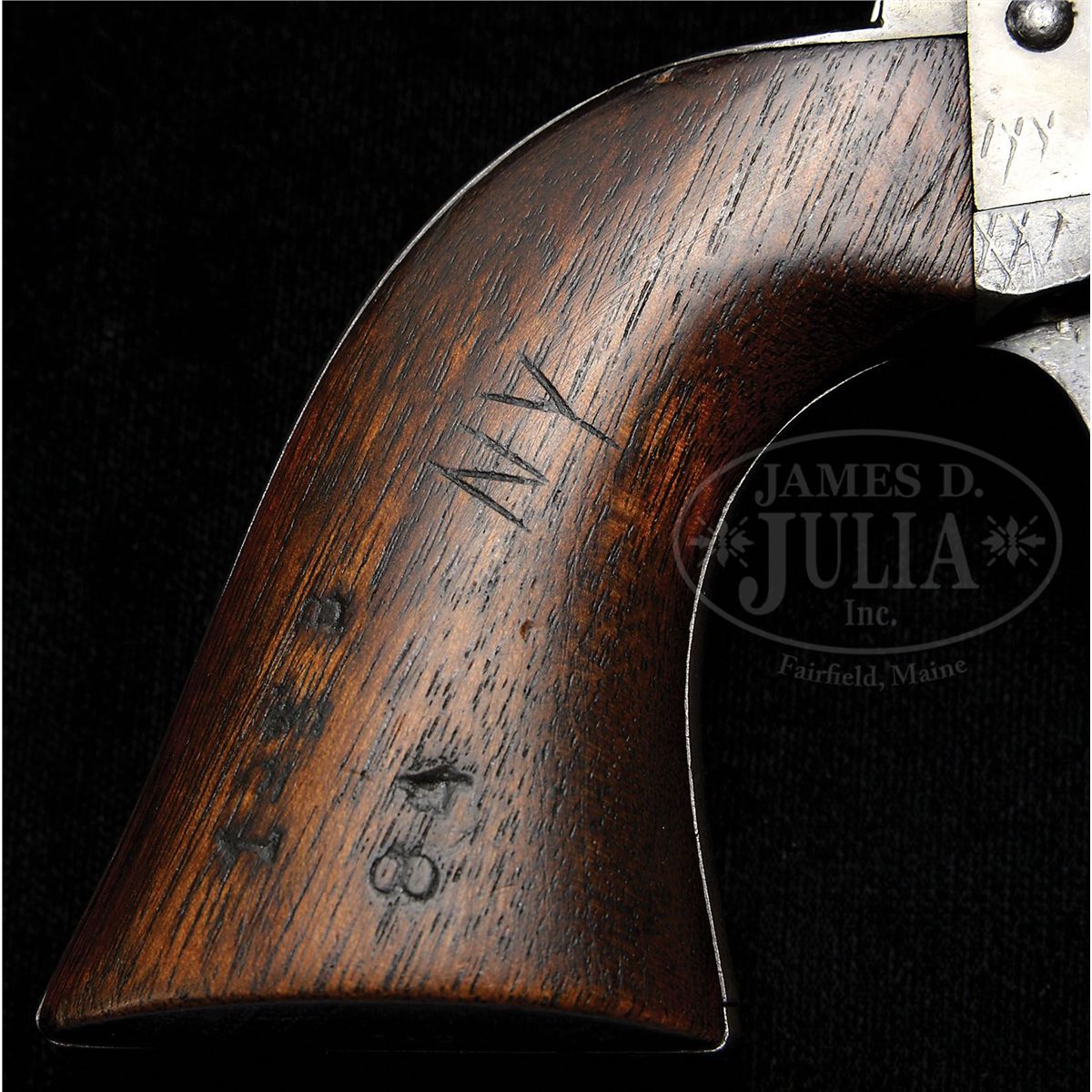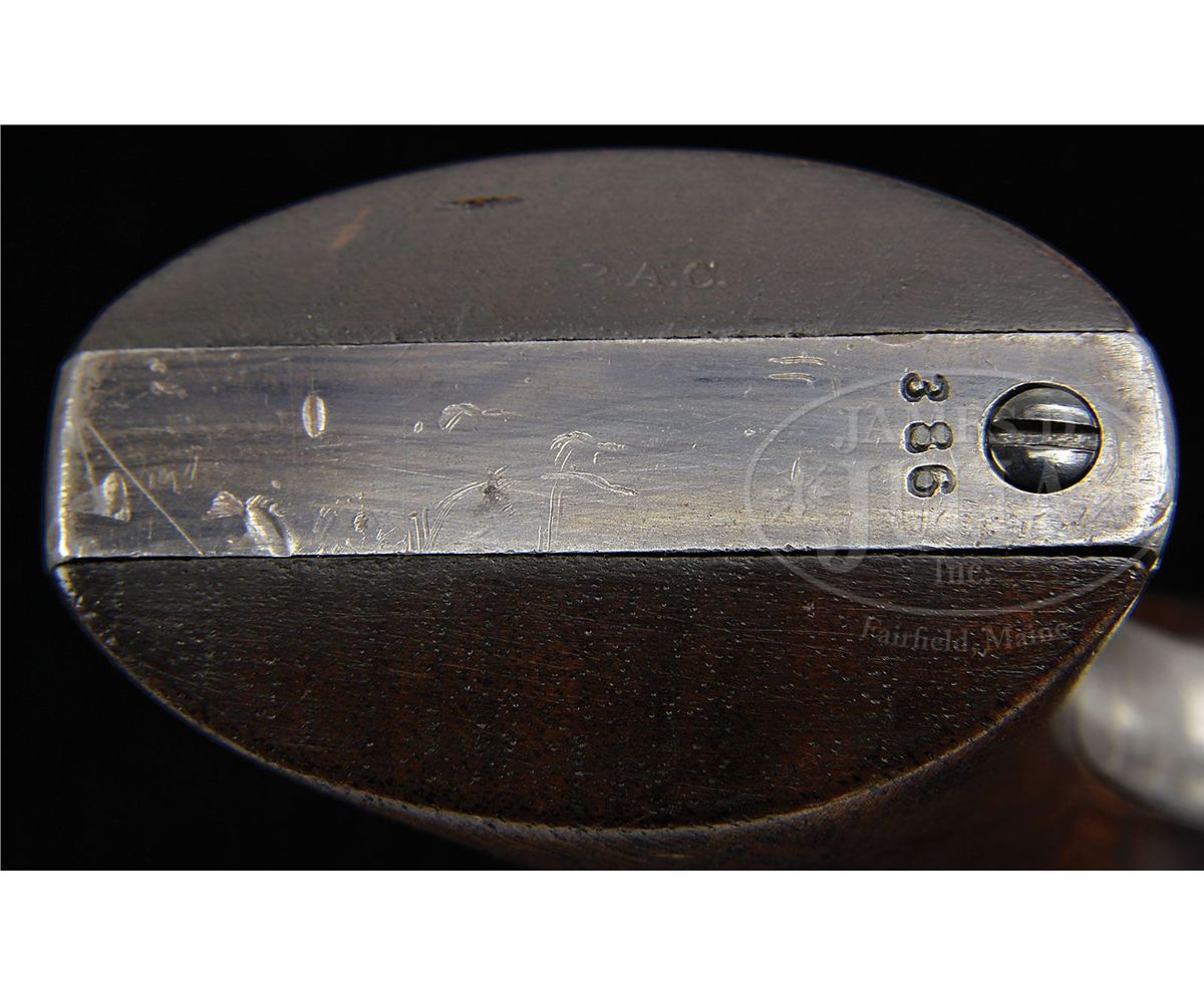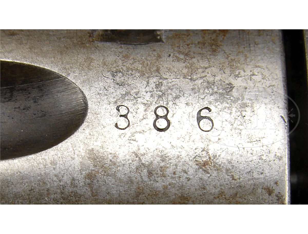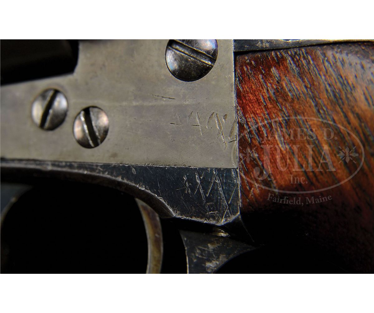 SN 386. Cal. 45 Colt. Blue & color case hardened with 7-1/2" bbl, full front sight and 1-line script address that has broken "O" in "Co" and broken "A" in "HARTFORD" with a broken tail in "C" in "CT". Left side of frame has 2-line, 2-patent dates and a small "U.S.". Ejector housing is first type with bull's eye ejector rod head and base pin is orig type with dimpled ends. Mounted with replacement 1-pc walnut grip that is marked "1 B" and "84" with a large "NY" (1st Battalion, rack #84). Bottom right of grip has "RAC" (Rinaldo A. Carr) sub-inspector initials and no visible cartouches. This indicates that this revolver was one of the 800 Cavalry revolvers recalled and refurbished by Colt in 1895 for issue to the New York State Militia. The toe of the buttstrap was radiused during the rebuild as the revolver in this serial range originally had sharp toes which the troops in the field did not like because they were uncomfortable to shoot and wore their holsters very quickly. Hammer is later type with short checkered panel on the spur and has the concave firing pin and is fire-blued, as is found on a number of New York State Militia issued revolvers. Various parts including bbl, cyl, trigger guard & backstrap are stamped with a tiny "A", the inspector initial of Orville W. Ainsworth. This revolver is one of the very few with exposed bbl SN. According to Colt Cavalry and Artillery Revolvers...A Continuing Study, Kopec & Fenn, this revolver is documented and listed by SN as having been issued to Company B, 1st U.S. Cavalry. The 1st U.S. Cavalry is one of the most famous and decorated Cavalry Units to ever take the field prior to and during the Indian wars. They were formed in 1833 in Missouri, fought in the Mexican War and were assigned to California in 1856 where they had continuing skirmishes with local Indians. They fought throughout the Civil War both in the East & in New Mexico & Arizona. They returned to California in January 1866 and participated in a number of fights with the Indians throughout Arizona, New Mexico, Nevada, Idaho, Oregon, Washington & Wyoming with 18 officers, NCO's & troopers earning the Medal of Honor. In 1877 they participated in the Nez Perce War, 1878 the Bannock War in Idaho and in 1881 fought the Apaches in Arizona and even chased them into Sonora, Mexico. In 1884 they were assigned to the Dept. of Dakota and were stationed at Fort Custer and from 1886-1918 at Fort Yellowstone, Mammoth Hot Springs, Wyoming. They continued fighting the Indians until all hostiles had been subdued. Undoubtedly right up until the time that this revolver was recalled in 1893, it was in use from its issue until recall, fighting hostile Indians. CONDITION: Very good, all matching except grip, as noted. Bbl retains about 60% refurbished blue showing light wear with the balance flaked; ejector housing retains bright blue in gullets and has a blue/gray patina on outer radius; frame retains traces of case colors being mostly faded to silver; cyl retains dark blue in the flutes, being a gray patina on outer diameter; hammer retains most of its fire blue on sides with the top & rear edges blue/brown patina; trigger guard & backstrap retain strong blue in sheltered areas with the front & back straps blue/gray patina. Both sides of frame and shoulders of trigger guard have vice marks. Grip is sound showing light edge wear and retains much of its orig oil finish with handworn patina. Mechanics are fine, bright shiny bore with a few scattered small spots of pitting. 4-48804 JR361