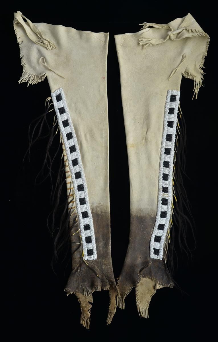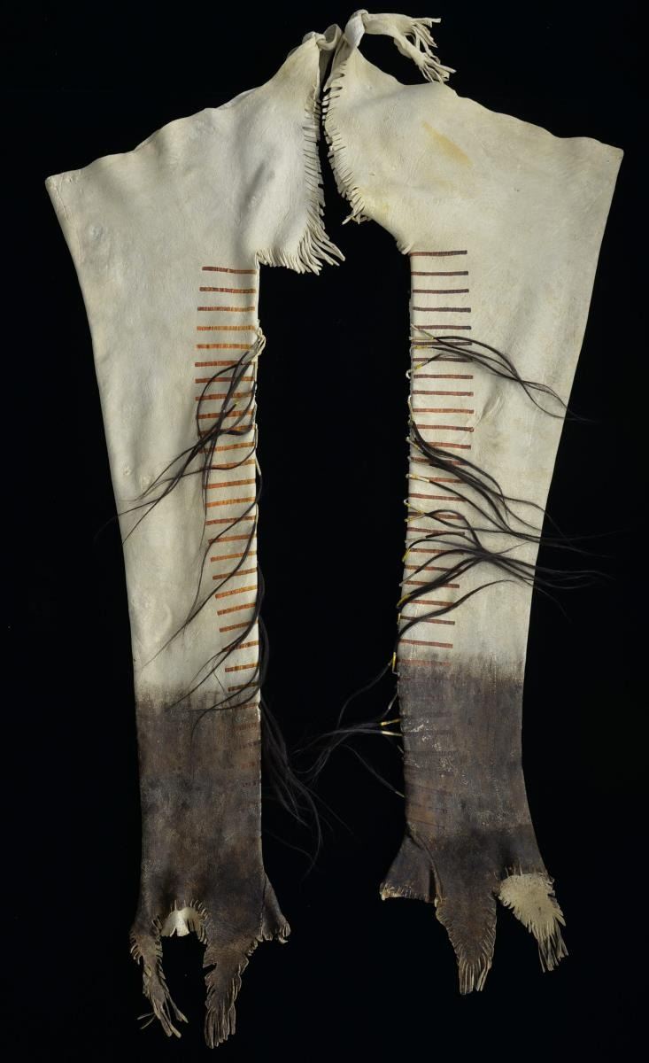 BUFFALO HIDE LEGGINGS. 45" Softly tanned buffalo hide, sinew-sewn leggings w/ 24.5" x 2" beaded hide strips of black & white pony beads. 10" Tassels of black hair fringe hangs along edges of strips; dark pigment applied lower 12". Nineteenth century. CONDITION: fine overall, complete, supple, losses of yellow pigment to porcupine quill wrap of hair fringe. (02-14572/JS). $6,000-8,000.
