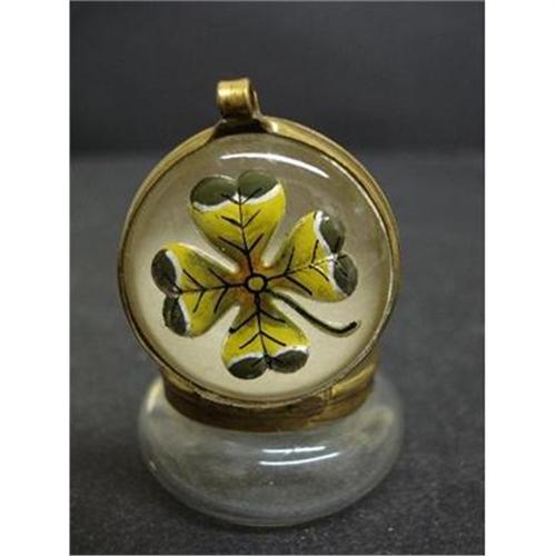 RARE AND AUTHENTIC VICTORIAN TINY PATCH BOX, LID DEPICTS 4 LEAF CLOVER IN GORGEOUS GREEN SHADES COLORS,SHOWING INSIDE THE THICK CURVED GLASS - HINGED AND FITTED WITH BRASS FITTINGS, CLOSURE WORKS JUST FINE, LOWER PART IS MADE FROM LOVELY CLEAR BUT RPUNDED GLASS-CRYSTAL,It stands about 1 1/4 high and close TO 1 1/2 inch in diam., excellent for age condition, no chips or cracks, brass could be polished, but i did not touch it, since it has that original antique patina., US Buyer please remit 7.00 for shipping plus insurance.THANKS.
