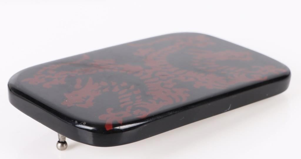 Rare vintage black bakelite red dragon belt buckle to include a deep rich black bakelite belt buckle embossed with an oriental red dragon design.