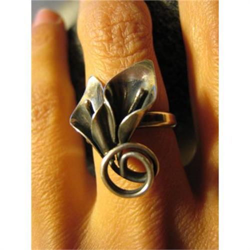 Rare Stuart Nye vintage calla lily ring. Sterling silver. Marked for sterling and NYE. Highly collectible and in excellent condition. Face of ring is approx. 7/8 of an inch long. The ring is approx. size 7 but it is an open adjustable band. $5.95 to ship in the USA. International orders are $24.95 Global Express. Thank you.