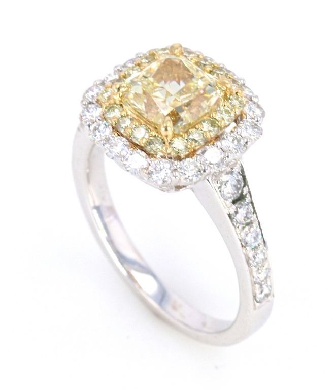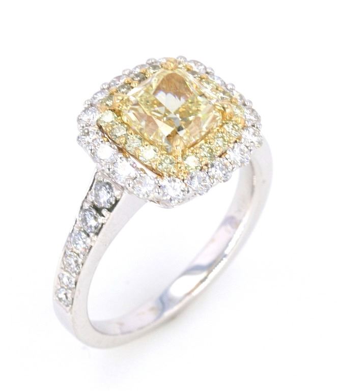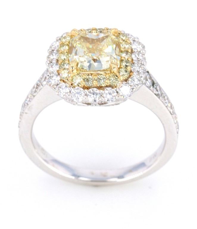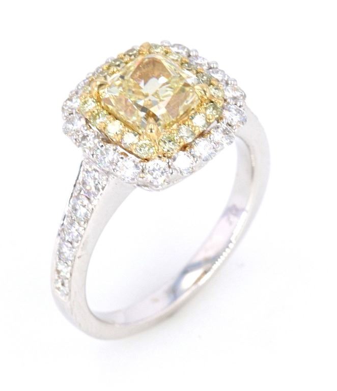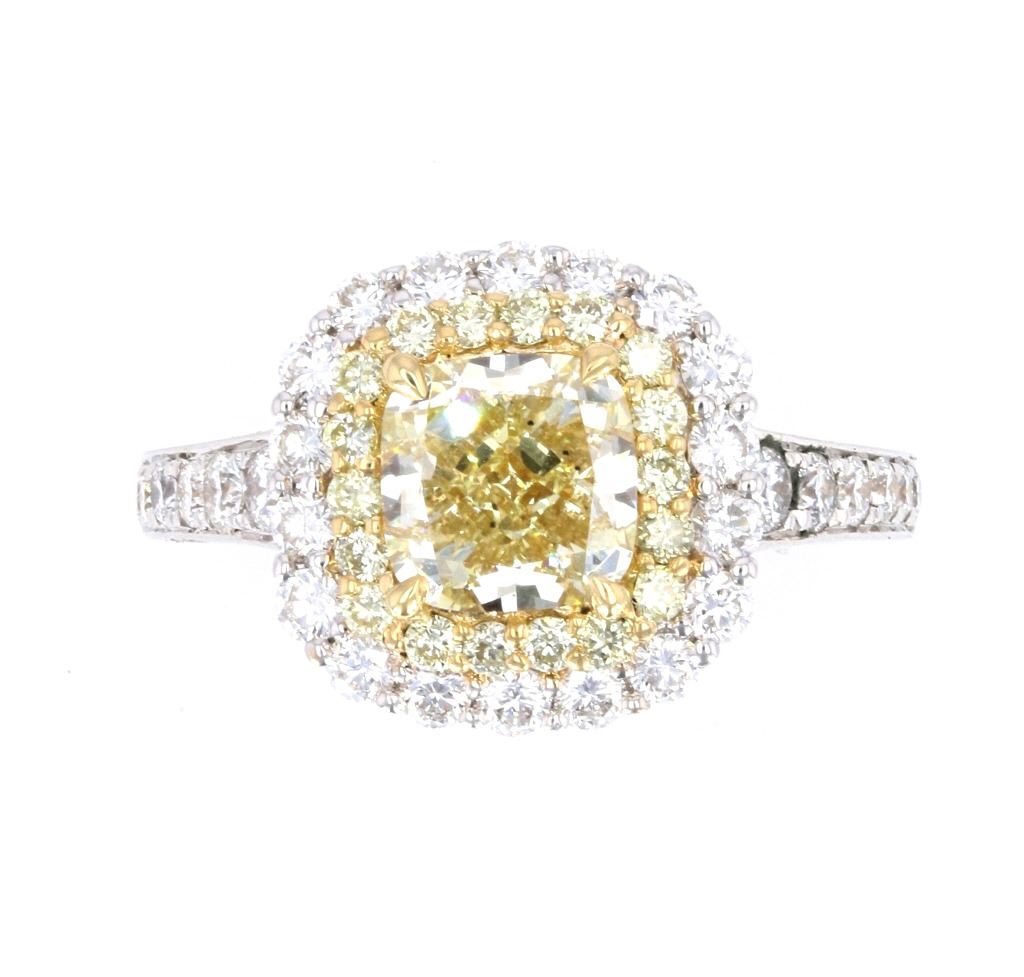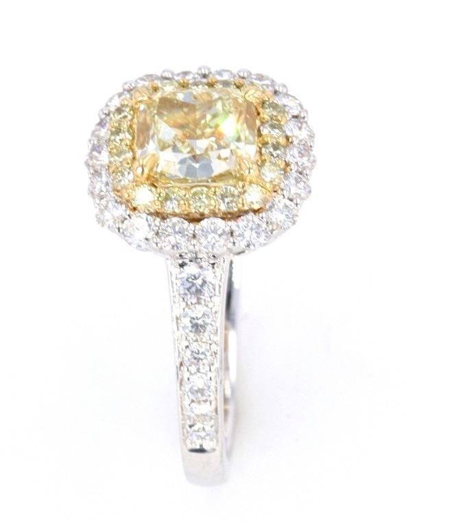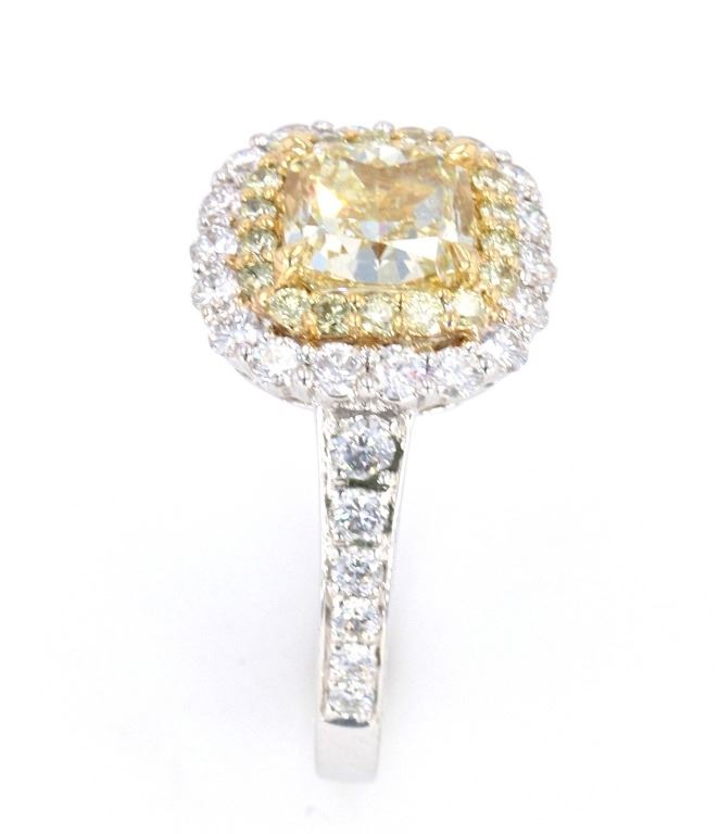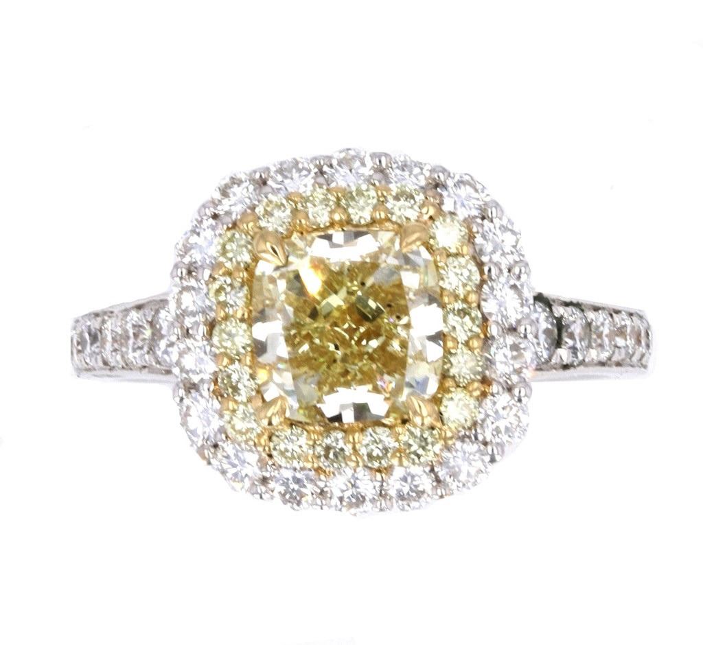 Offered for sale in this lot is the finest Fancy Yellow Diamond we have offered being of a VVS2 clarity and 2.02 carat weight. VVS2 is only one grade away from being considered IF or Internally Flawless. The stone was graded by GIA (the Gemological Institute of America; GIA Report # 2185724518) as being a VVS2 stone; GIA is the highest standard of gemological reports. The stone shows a rare Fancy Yellow to Fancy Intense Yellow coloring with cushion cut in a very large 2.02 carat size. The stone has an unparalleled depth and brilliance. The Fancy Yellow Diamond is four-prong set with a stepped halo bezel in yellow gold showing 18 round brilliant cut Yellow Diamonds with a weight of 0.27 carats which is further accented by a larger stepped halo bezel of Diamonds that are also set down the shoulders in a nearly-colorless good clarity and weight of 0.86 carats (total of 30 round brilliant). Overall, the ring shows a total of 3.15 carats of natural diamonds set in 18 karat white and yellow gold band which is finely crafted and shows a raised setting with lattice under gallery and is stamped 18K CJ. The ring is in brand-new condition and is a size of 7 US. Similar VVS2 cushion cut over 2 carat Fancy Yellow loose stones by themselves are regularly priced over $20,000 (that is a loose stone without the custom luxury setting and additional diamonds).