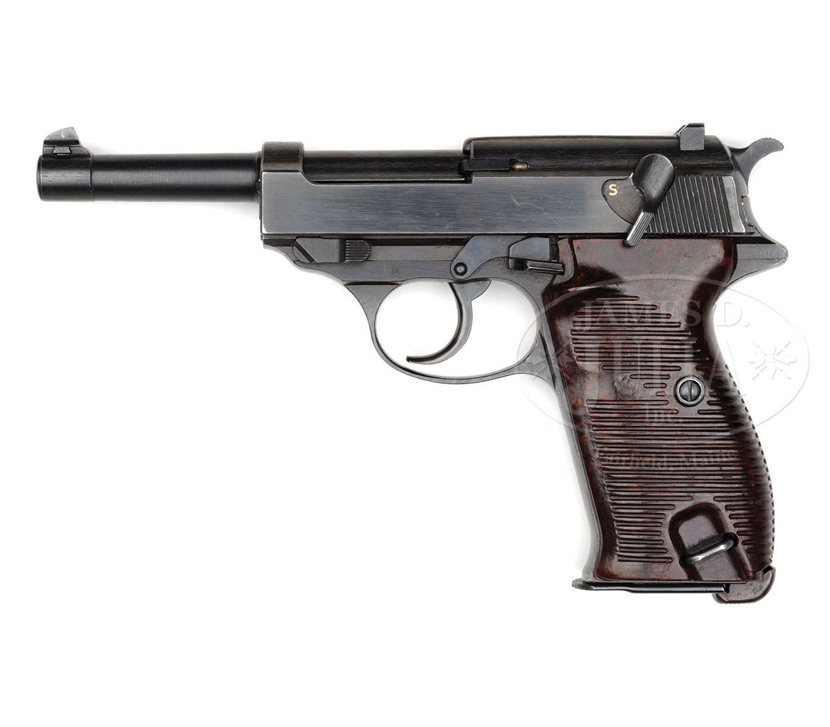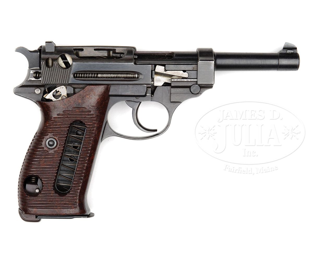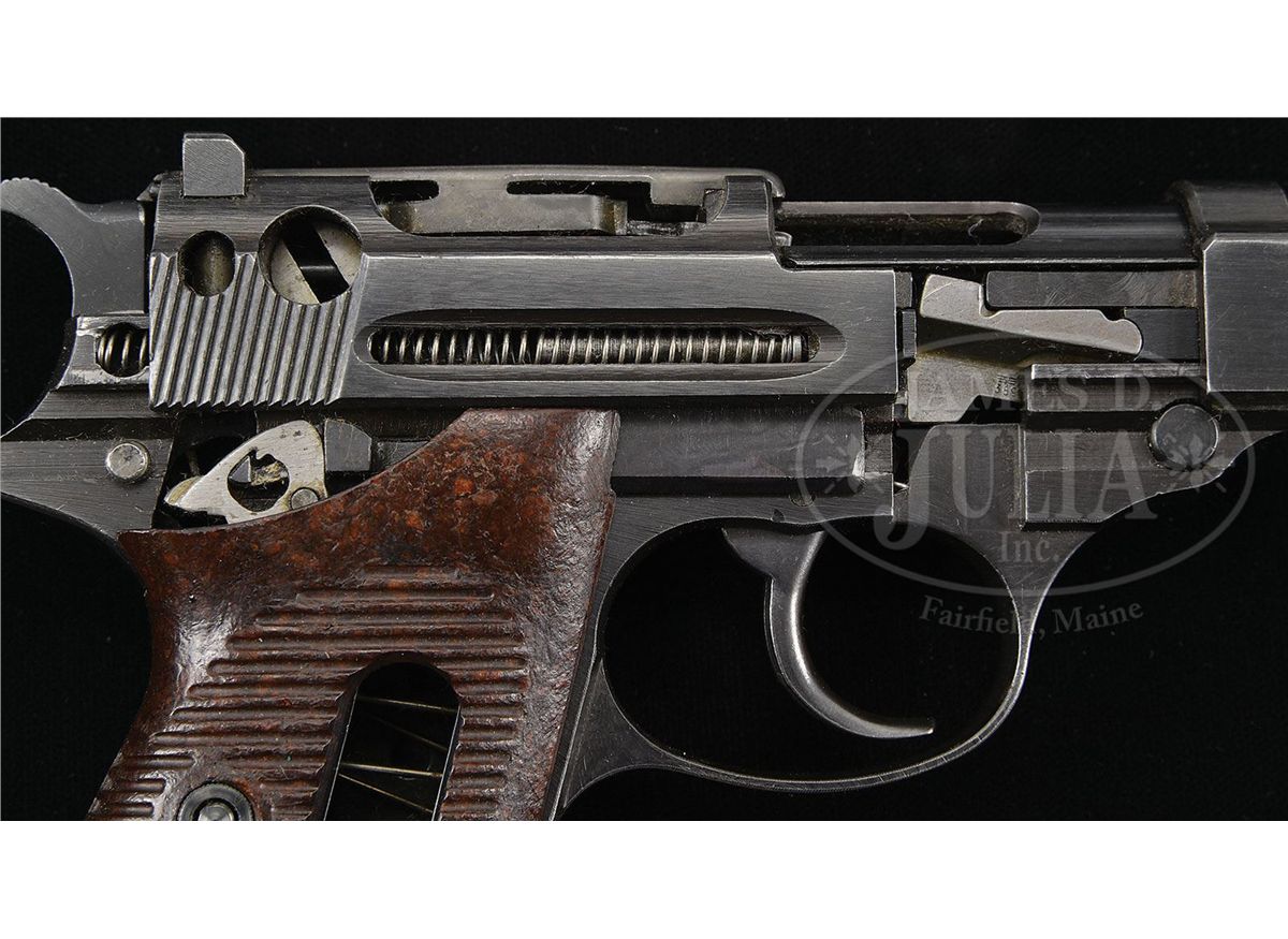 SN 3A. 4.9" 9mm bbl. No markings, proofs, or serial numbers other than a very small "3A" on the left side of the frame, added by importer, and an Eagle/359 that is visible on block through the cut above the trigger guard. Factory cuts made on the right side of the pistol through frame, receiver, and some small parts to show all inner workings. Left side appears normal with no cuts. Horizontal grooved brown plastic grips have cuts upon right side to show inner workings of gun and magazine. Magazine is cut on right side so that magazine spring is visible through cut in right grip and is marked "P.38" on the bottom of the left side. All components are to full standard dimensions indication that these are factory new, originally unmarked components, not modified from a standard pistol by removal of markings. PROVENANCE: Collection of Dr. Geoffrey Sturgess. CONDITION: Excellent retaining 97% orig blue. Bore is sharp with light frosting. Grips are excellent with very little wear and retaining most original gloss. Magazine retains 97% orig blue. Mechanics are excellent. 4-52663 BWS112