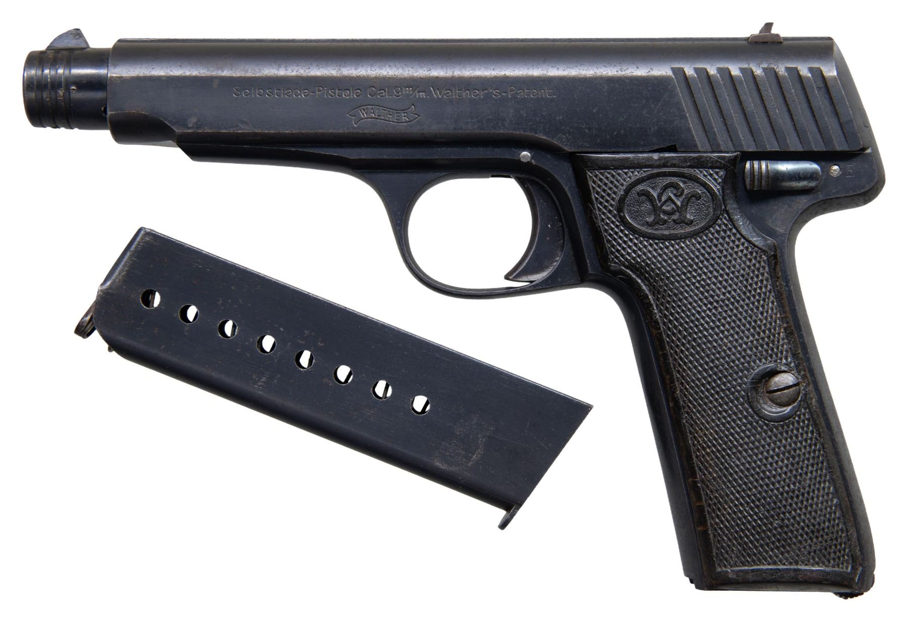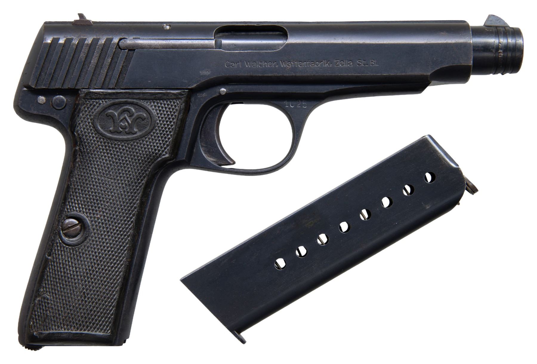 Cal. 9x19mm. S# 1025. Bbl. 4 3/4". Standard configuration Walther Model 6, single action blowback pistol, with 4.75 bbl, fixed front sight and drift adjustable rear sight. The left side of matching slide is marked with a single line legend "Selbstlade-Pistol Cal 9 m/m. Walther's-Patent" over Walther banner. Right side of slide marked "Carl Walther, Waffenfabrik, Zella St. Bl.". C/N proofing over the exposed chamber and immediately below on the slide and frame. SN "1025" on the right upper trigger guard. Hard rubber grip panels each with an encircled C/W at the upper portion. Elsewhere checkered with a generous border and secured with a single screw. Unmarked magazine with eight indicator holes. Original rust blue finish that has been applied to all major and most minor parts except the fire-blued extractor and grip screws. MAGS: 1 9-rd. CONDITION: approx. 80% original rust blue finish, most of the wear associated with scattered superficial flecking rather than the more traditional holster wear. The safety/hold-open lever, appropriately aged, is likely a replacement. Comparable condition hard rubber grips with blunted checkering and a scattering of light handling marks, most noticeable on the right panel. Excellent original condition mag. Bright bore with sharp rifling. Correct manual mechanics. The most desirable and largest of the numbered Walthers whose production was limited to about 1,000 pistols, this example one of the last to be completed. (25-3542/LMA). CURIO. $5,500-8,500.