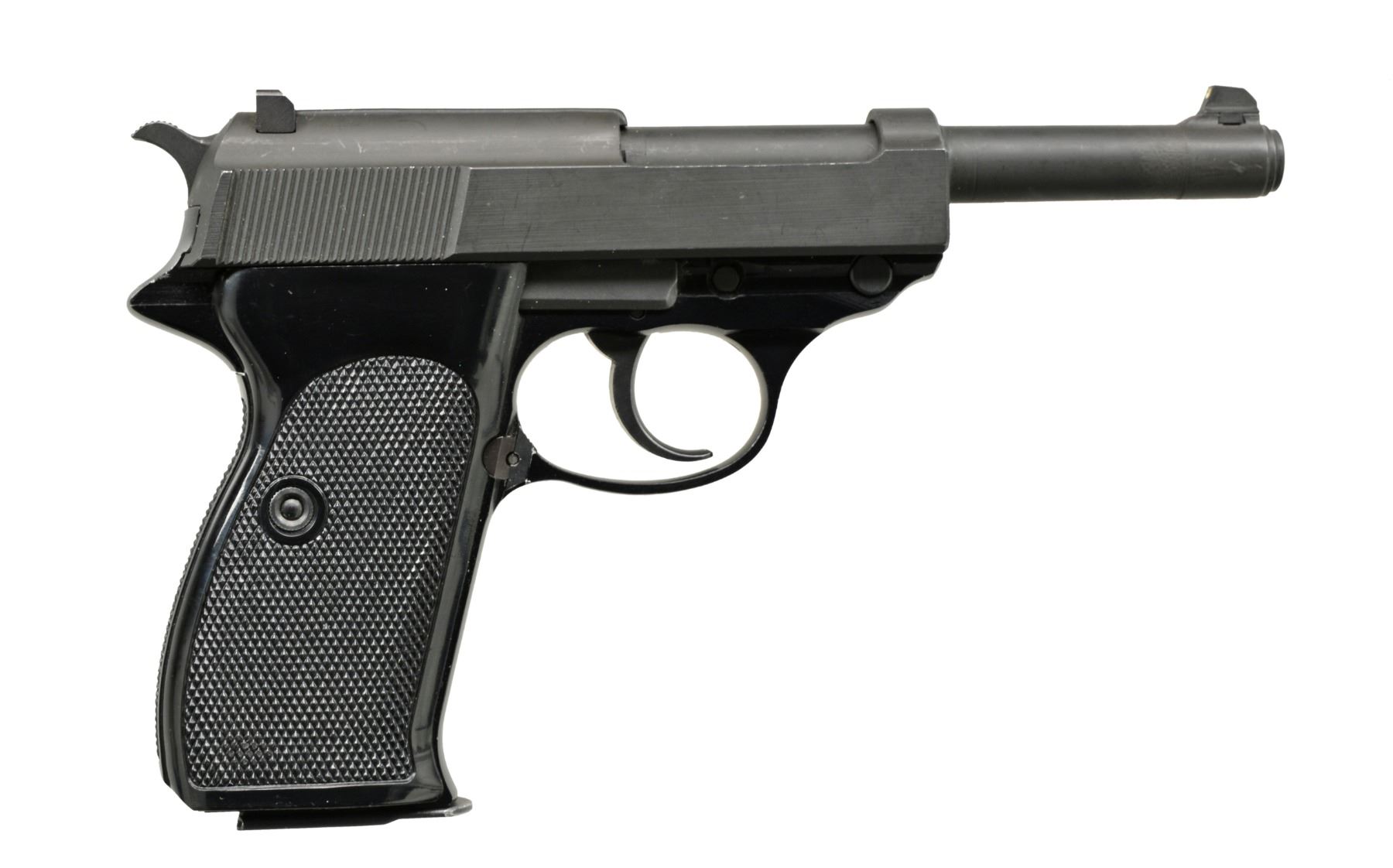 Cal. 9mm Luger. S# 5. Bbl. 5". Pistol has most standard P1 features & markings except S# 5 is stamped inside frame just forward of frame recoil reinforcement bar plus push button mag. release at rear of trigger guard. Left side of slide has circle dot proof at front followed by Walther banner & ends w/ "P1 Kal. 9mm" over "5/76" & 4 pointed star. Safety markings are white "S" & red "F". Pistol void of any other numbers or proofs. Square faced front sight has recessed white dot & "4" on left side; rear sight has inset white bar below wide squared notch. Standard checkered black plastic P1 grips w/ cut out for its lanyard loop, thumb position for RH use & relieved for push button mag. release. Bottom left side of frame between grip & mag.-well opening has Simpson Ltd. import mark. MAGS: 1 commercial Walther 8 rd. w/ bottom left having Walther banner plus "P38 9mm". Modern follower w/ dbl. reinforcing grooves. Notch for latching mag. formed w/ end mill of 11/64" diameter to depth of 7/64" from side of body. Upper 3/4 of mag. polished to in the white; remainder of body polished blue w/ push button floorplate matte finished (no witness marks from regular P38 latch). CONDITION: all aspects near excellent including bore & grips. PROVENANCE: Ex Hen Visser Collection; Ex Dr. Geoffrey Sturgess Collection. (20-340/NW). MODERN. $3,500-5,000.