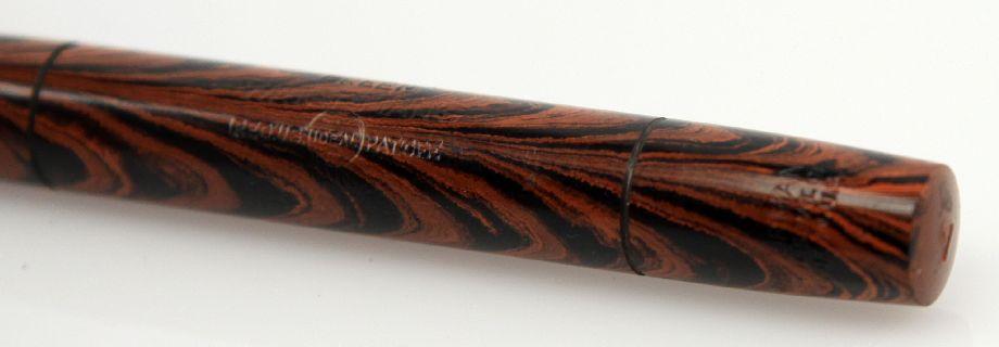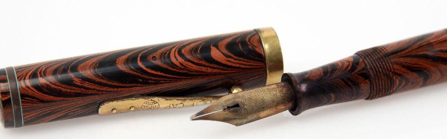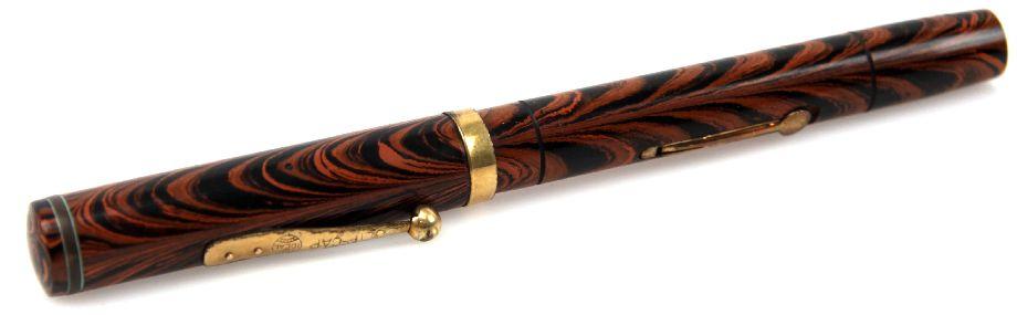 A 1920's Waterman red ripple #7 lever fountain pen in very good condition with no monogram, dents or deep scratches. Pen measures 5.75 inches. It is in need of a new ink bladder and will need service.
