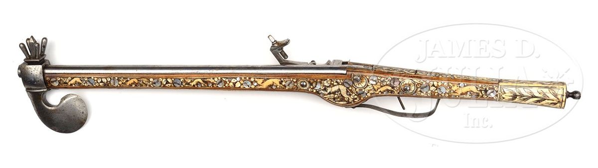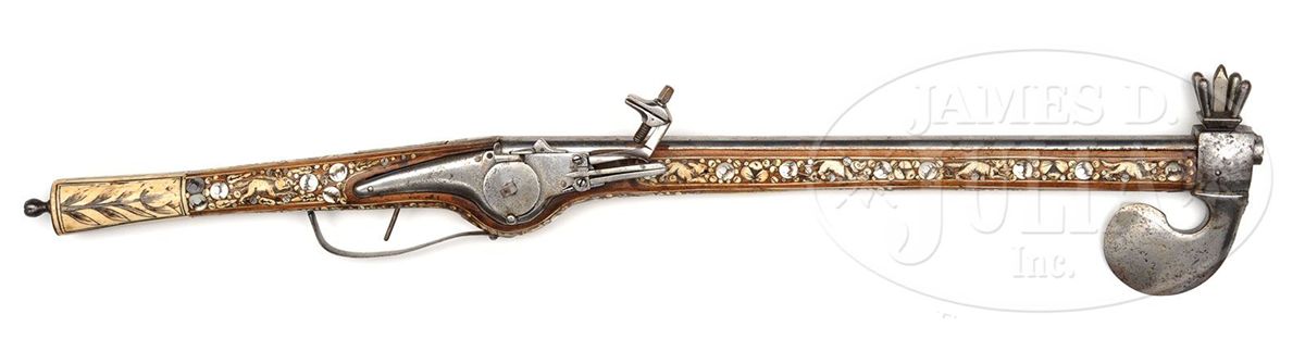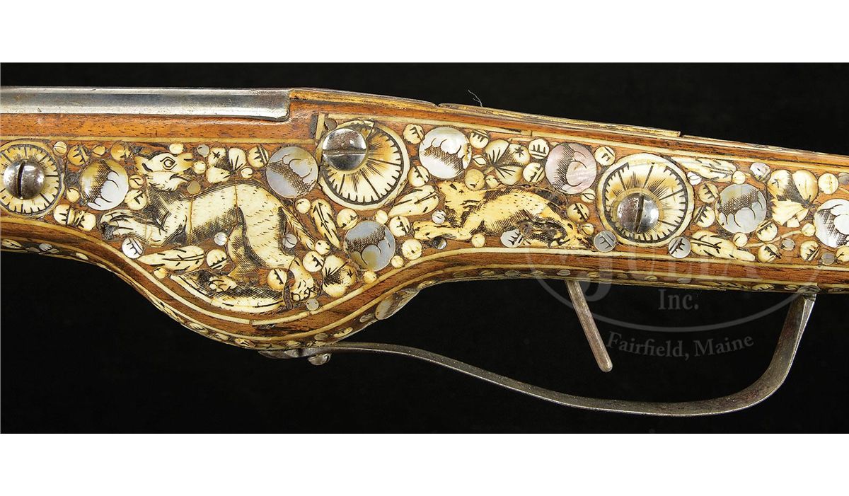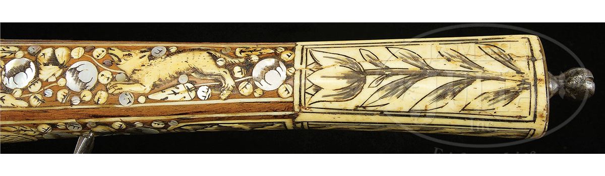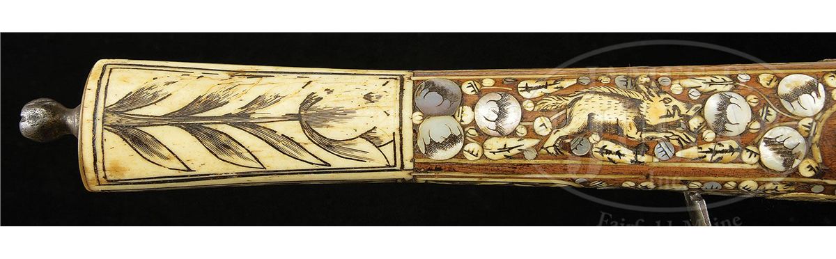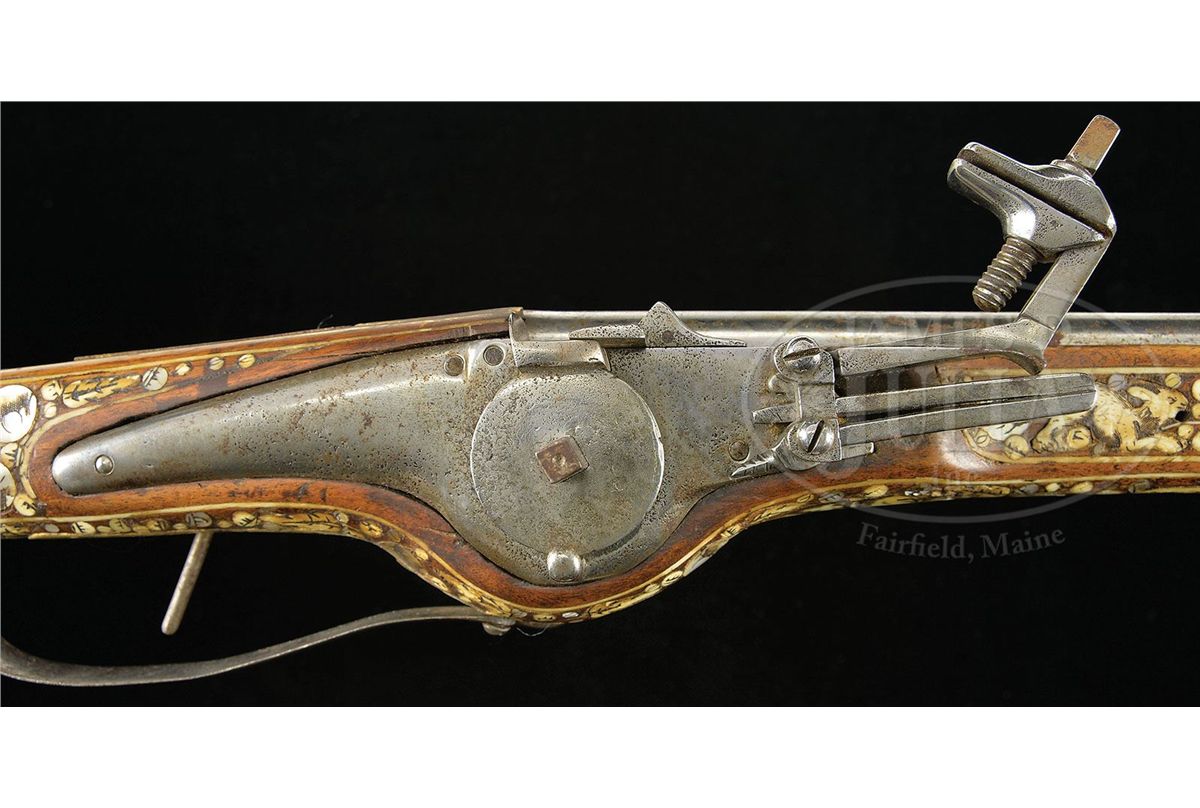 NSN. Fokos are normally found with flintlocks. To find one with a wheel lock is unusual and rare. These were not made primarily as weapons, although they could be used as such. they were made to carry in processions as badges of rank and emblems of status in Silesia. This one is of typical form with a long bbl ending in an axe. Lock is of German military type. Axe is unusually well formed with a helmet crusher on the hammer end. Round bbl of typical military form. The fruitwood stock is elaborately inlaid in the Silesian manner with animals and white stag horn, pearl flowers and fabulous monsters. Butt ends in an iron sprue and large stag horn grip. NOTES: An extremely good example of this rare type which belongs in both European collections as well as oddity collections. CONDITION: Overall is fine with few if any inlays replaced and one pearl flower missing. Otherwise inlay is substantially intact and original. Lock has very minor pitting overall but is polished bright. Bbl is polished bright as well. Axe is crisp with only minor pitting on blade surface. 4-49137 MRZ67