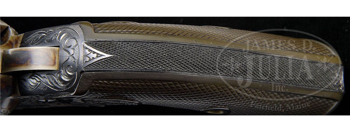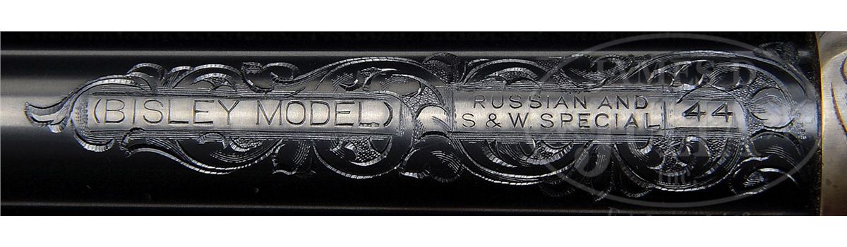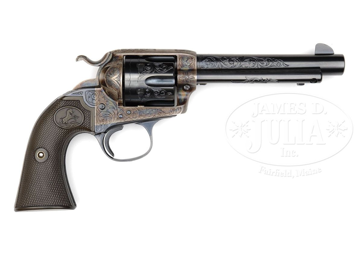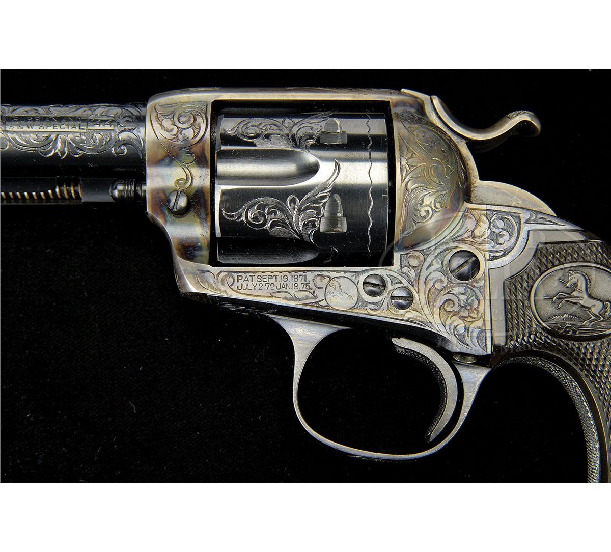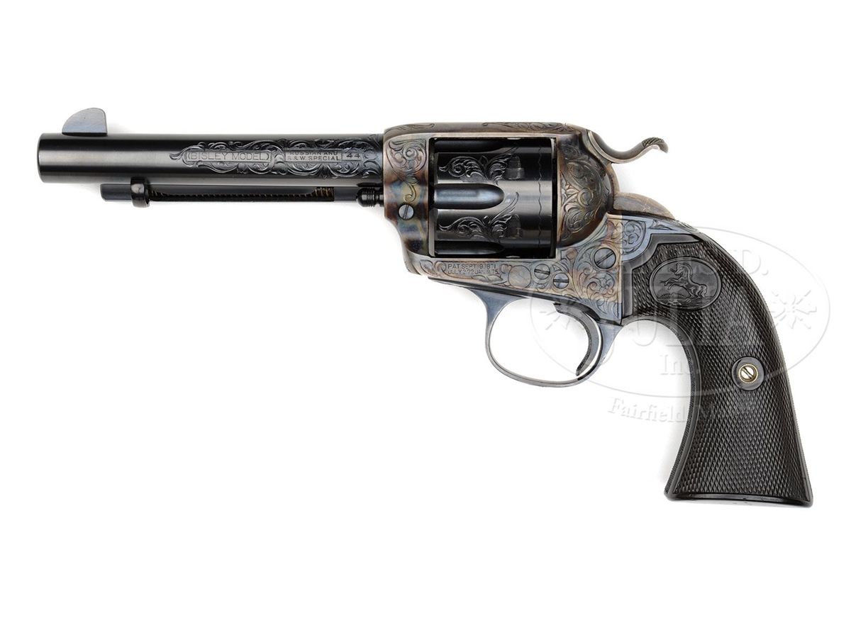 SN 282422. Cal. 44 Russian & S&W Special. Blue and color case hardened with 5-1/2" bbl. Full thick front sight & one-line block letter address with left side marked "(BISLEY MODEL) RUSSIAN AND / S&W SPECIAL 44". Left side of the frame has 2-line 3-patent dates and Rampant Colt in a circle. Mounted with 2-piece Rampant Colt hard rubber grips. Revolver is engraved by Wilbur Glahn in his typical flowing foliate and floral patterns that have very fine pearled background with the frame having about 70% coverage. Matching engraving patterns extend up both sides of the bbl, top of the backstrap, buttstrap & trigger guard. Recoil shield, loading gate, top of the backstrap & buttstrap have Mr. Glahn's distinctive V-shape patterns. Front strap, backstrap and trigger are beautifully checkered. Left side of the buttstrap, frontstrap and inside ejector housing are marked with the assembly No. 1074B. This indicates that this revolver was returned to the factory for restoration which is likely the time that Mr. Glahn was commissioned to engrave it. Accompanied by a Colt Factory Letter which identifies this revolver as a Bisley Model in Cal. 44 with 5-1/2" bbl, blue finish, type of stock not listed and shipped to Schovering, Daly & Gales, NY, NY on Oct. 4, 1906. While this revolver was not originally factory engraved, it certainly was engraved by a factory engraver at the time it was returned for restoration. The bbl and cylinder were probably replaced at the same time. The bbl is quite rare with its dual caliber marking. CONDITION: Pristine, new and unfired. Retains virtually all of its crisp factory finish with bright blues and brilliant case colors. Grips are sound, showing light to moderate diamond point wear, and the right side turned a little chocolate. Mechanics are crisp, brilliant shiny bore. 4-49404 JR302
