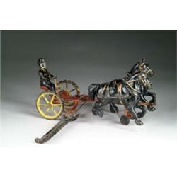 RARE WILKINS HORSE-DRAWN MOWER. A red mower with yellow wheels, a black mowing deck, two black enameled work horses trimmed in gold & red being driven by a farmer painted yellow and black with a flesh toned face. These farm toys are scarce! SIZE: 9-1/2” l. CONDITION: Very good with some overall wear. MC 1-3953 (2,200-2,500)