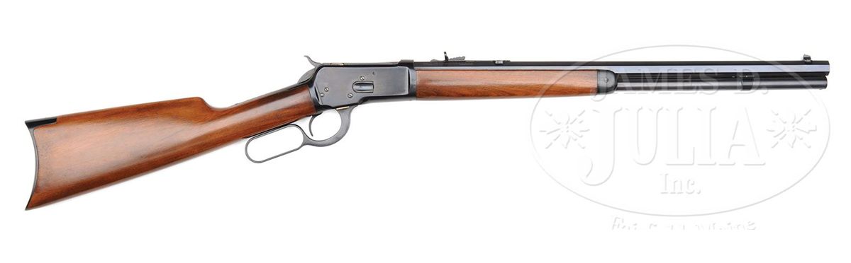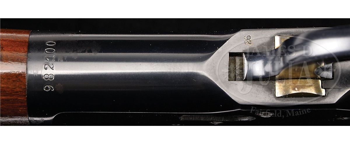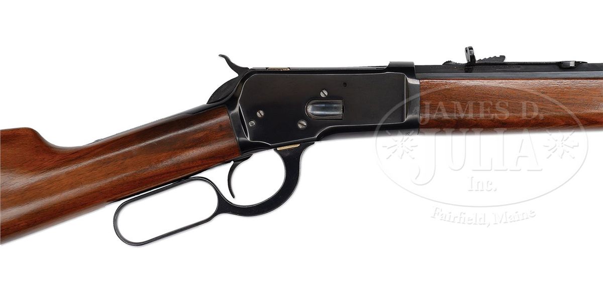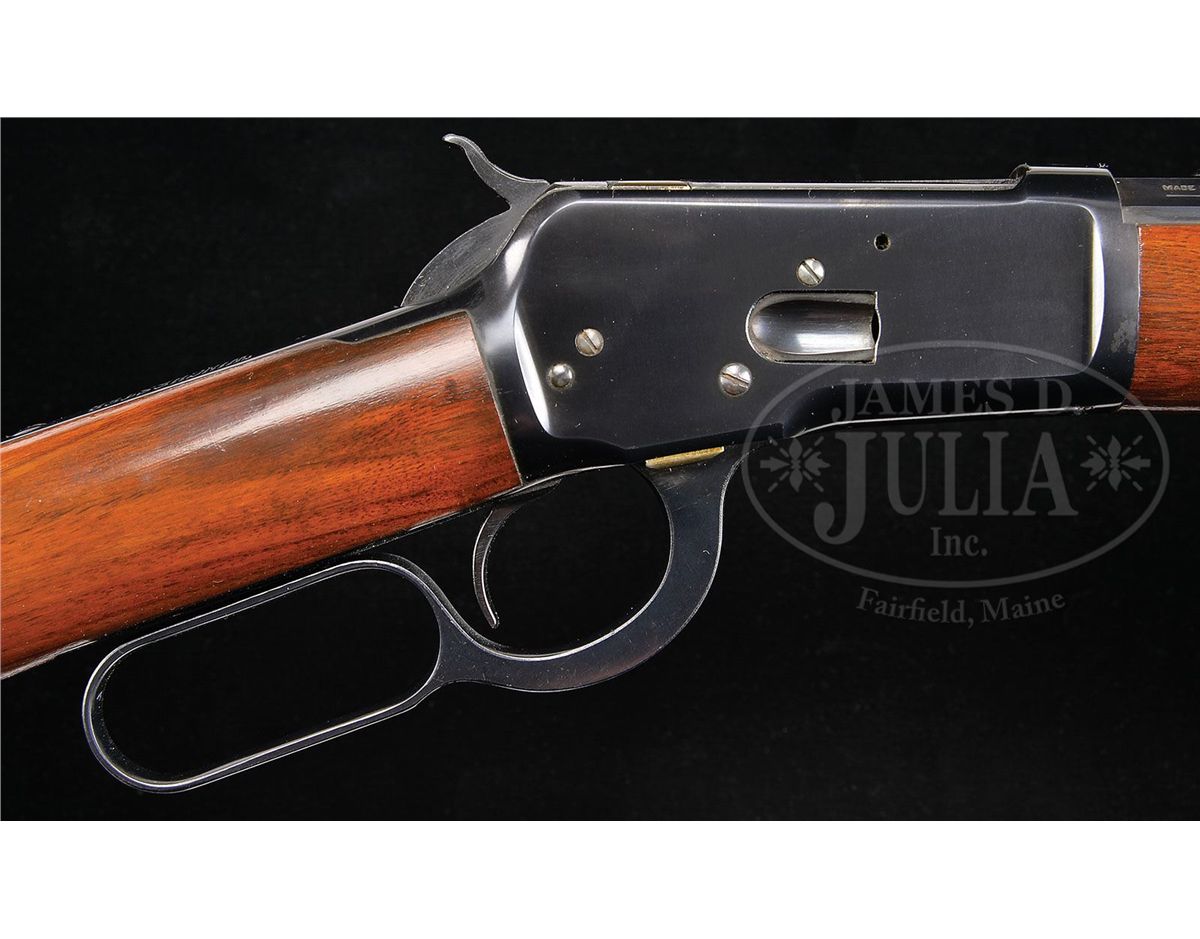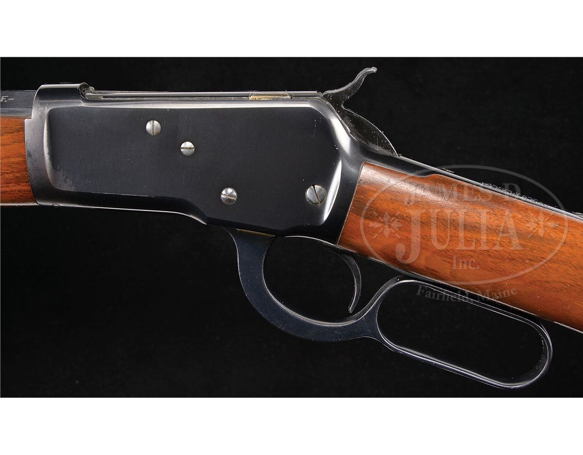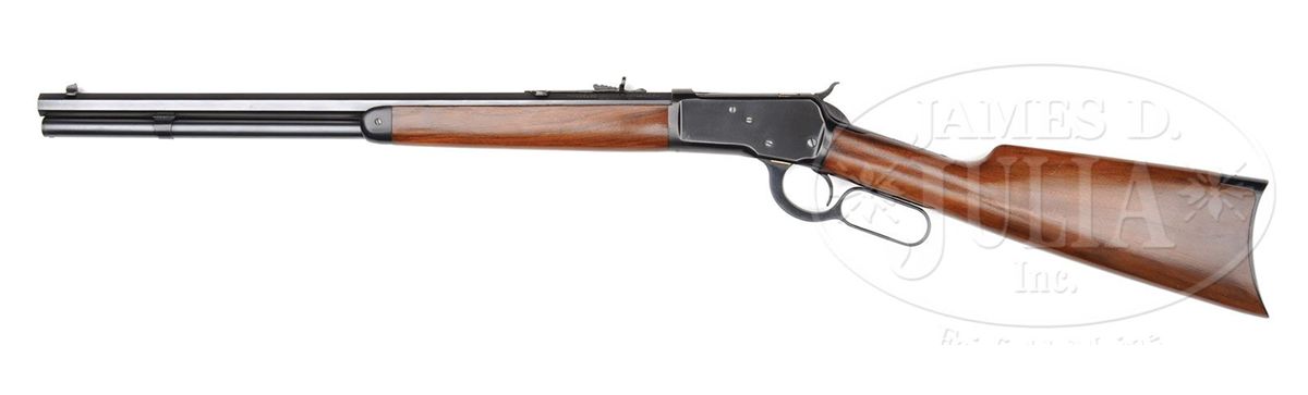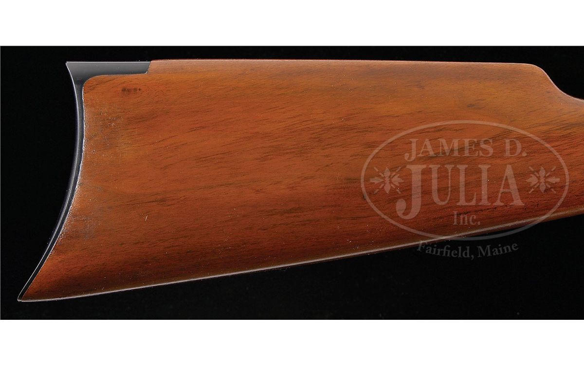 SN 982100. Cal. 44 WCF (44-40). Standard grade rifle with 20" oct bbl, full magazine, standard front sight with screw & semi-buckhorn rear sight. Mounted with uncheckered, straight grain American walnut with rifle forearm 8-3/8" long and straight stock with crescent buttplate. While these special order short rifles were available to the general public it has been this cataloger's experience that the majority of them were ordered and used by the movie industry. Most of the movie industry short rifles were made up from left over parts and frequently show unusual configurations, however that is not the case here. This rifle is completely orig in all ways & remains as ordered. PROVENANCE: Woody Frey Collection. CONDITION: Extremely fine plus, all orig. Bbl, magazine tube & forend cap retain about 99% plus crisp, orig blue. Front sight has a small ding on the top edge. Receiver retains about 95% crisp, orig blue with the loss area on the left front edge from flaking, not wear and that area is now a dark patina. Lever, hammer & buttplate retain about 99% crisp, orig blue with one small spot of flaking on the buttplate. Wood is sound with 1 or 2 small mars in the finish with no other visible flaws and retains virtually all of its crisp, orig factory finish. Mechanics are crisp, brilliant shiny bore, appears to be new & unfired. 4-48446 JR222