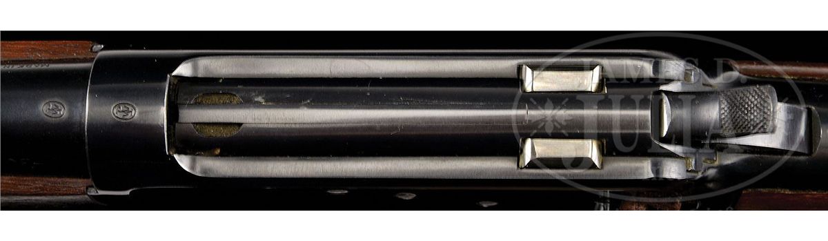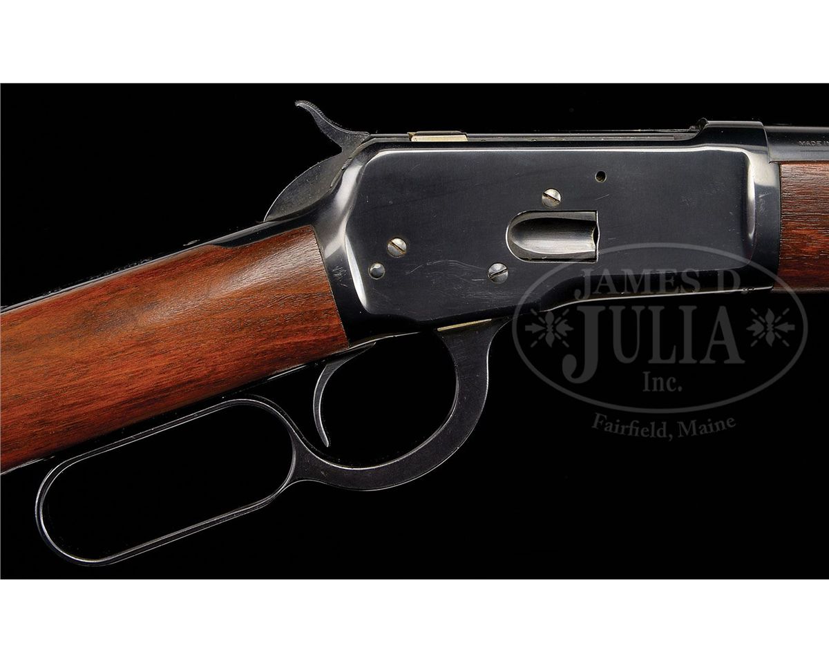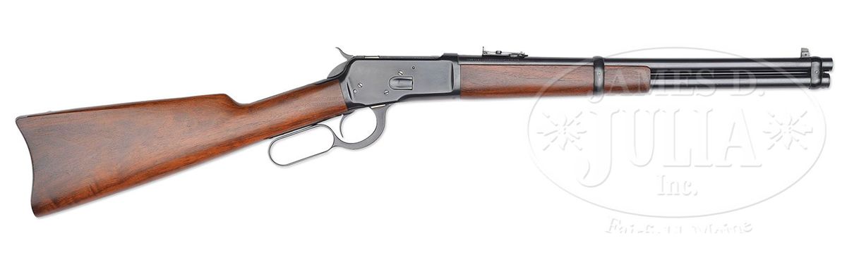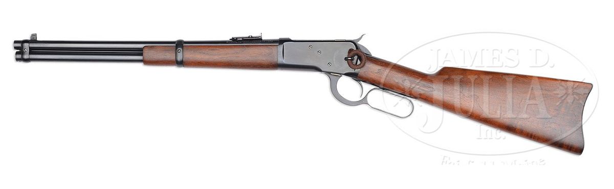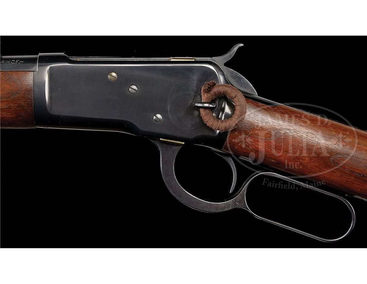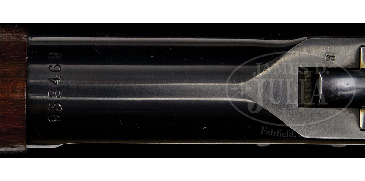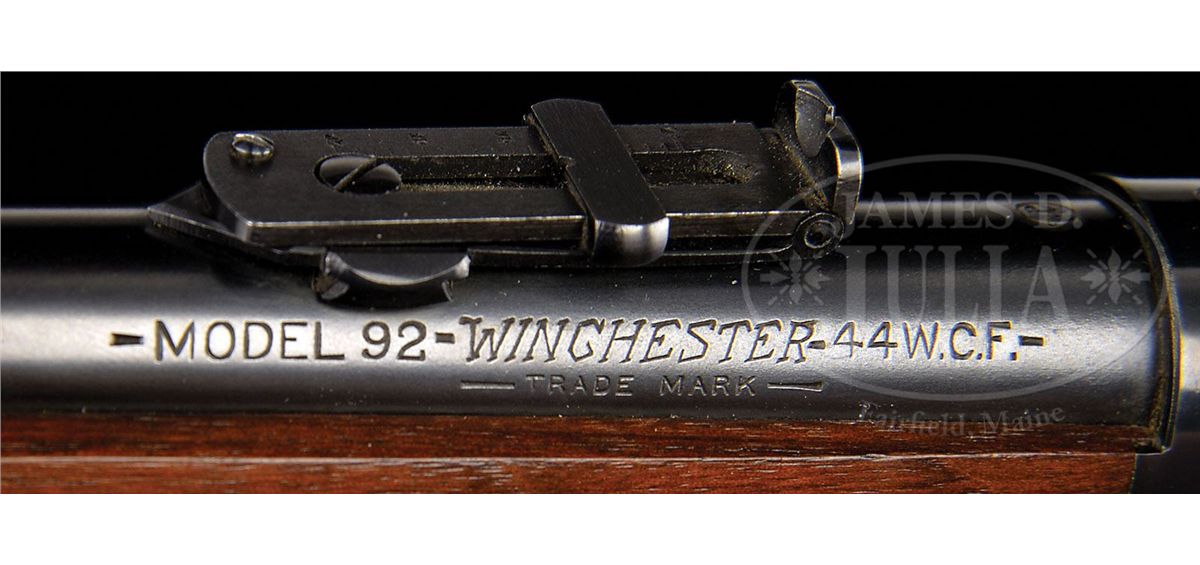 SN 953469. Cal. 44 WCF (44-40). Standard grade trapper carbine with 16" rnd bbl, full magazine, square base front sight and 2000 yd. carbine ladder rear sight. Left side of receiver has a staple & ring. Mounted with very nicely figured, uncheckered, slab sawed American walnut with straight stock & carbine buttplate. Trapper carbines with any orig finish are rare, but to find one with high orig finish is an extreme rarity, almost never encountered. The majority of trapper carbines were sold onto the South American market and were used in the tropical jungles and are usually found in next to horrible condition with no finish and poor mechanically. PROVENANCE: Woody Frey Collection. CONDITION: Extremely fine plus, all orig. Overall retains about 99% crisp, orig finish with only a faint halo from the saddle ring & some very faint scratches on the right side of the receiver. Forearm has a tiny bruise which appears to be the only flaw and overall the wood retains a near perfect orig finish. Mechanics are crisp, brilliant shiny bore. Appears to be new and unfired. 4-48454 JR218