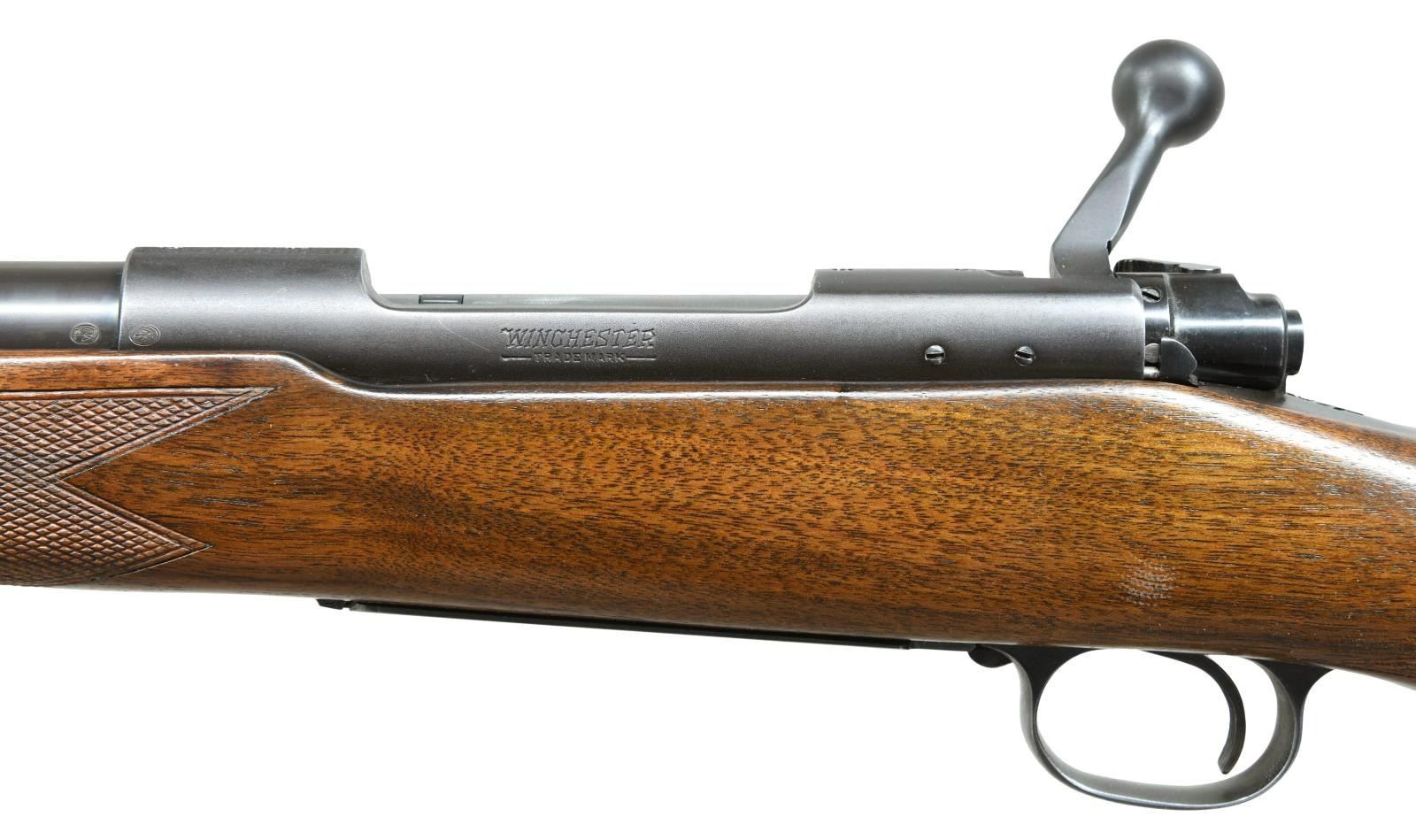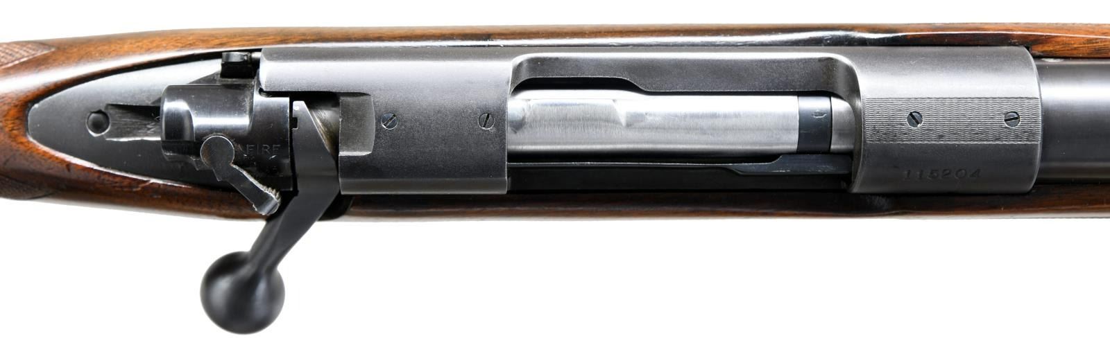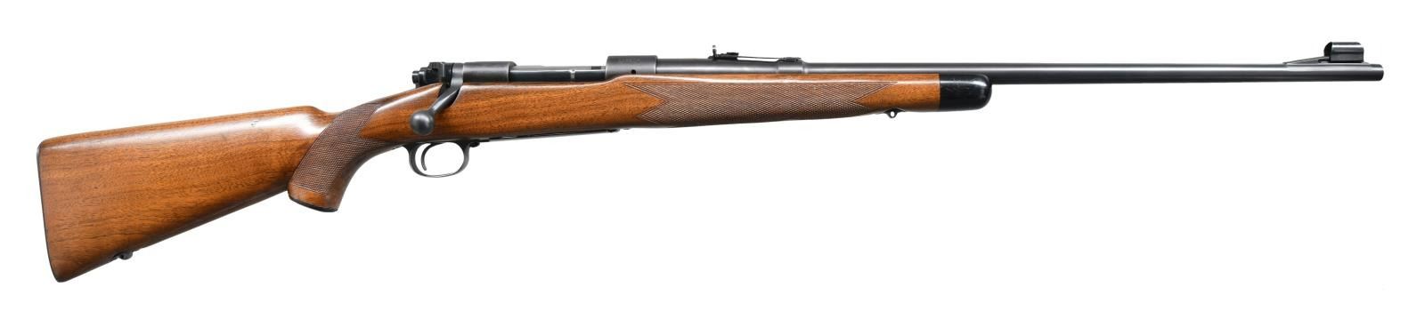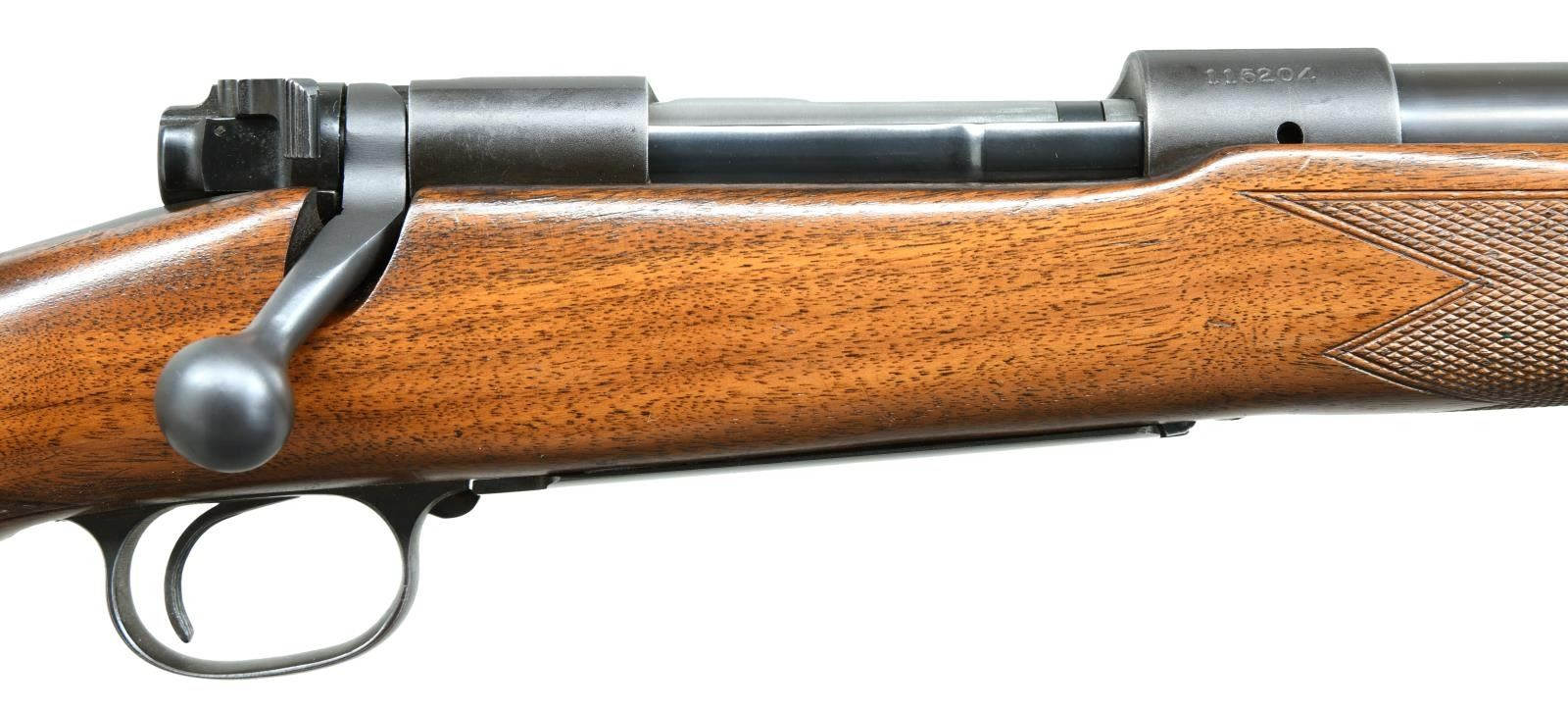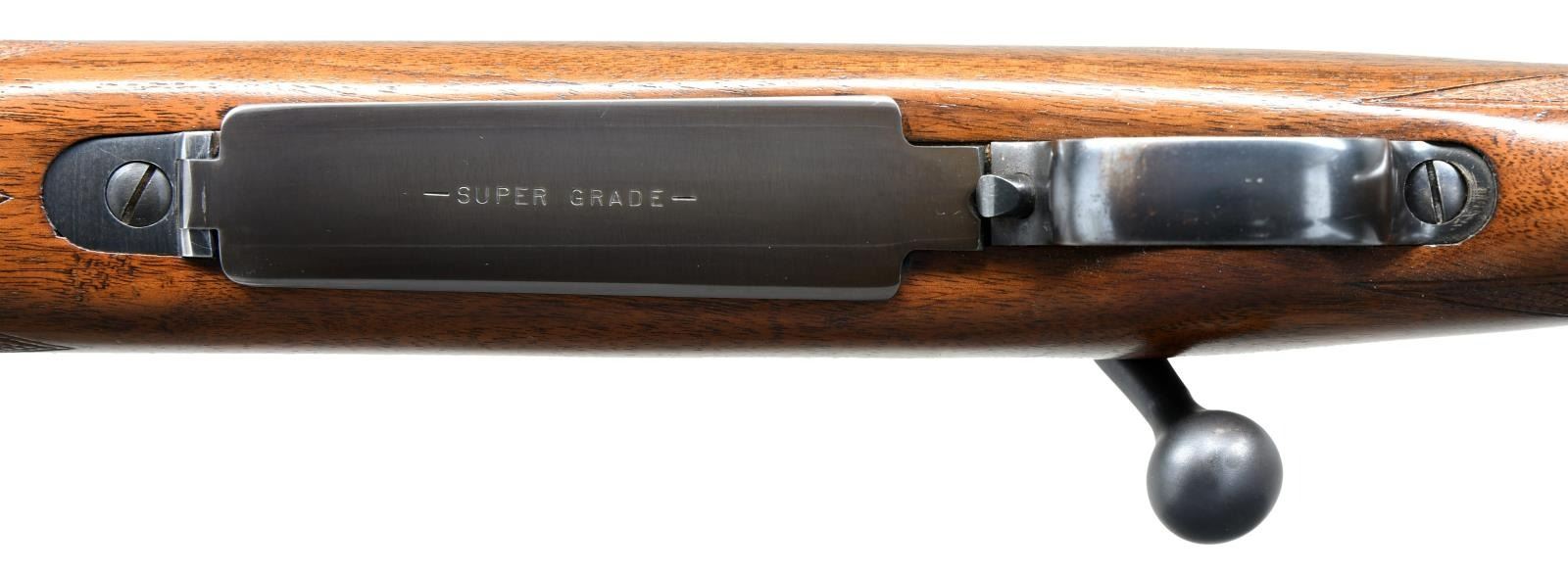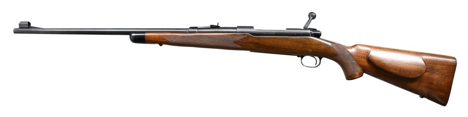 ACTION RIFLE. Cal. 7 M/M (7x57). S#. 115204. Bbl. standard 24" is dated "49" on bottom. Hooded stippled ramp front sight with Lyman 103C brass bead. Standard 22G rear sight. Bolt body is polished and renumbered to the rifle. Low comb stock has proper post war 20 LPI Super Grade checkering and small oval cheekpiece .Features include black forend, hard rubber grip cap, Super Grade swivel bases and checkered steel buttplate. Floorplate has added pantograph cut Super Grade marking. Mfg. in 1949, the last year the 7MM was cataloged. CONDITON: Bbl. & receiver show 90% dulled blue indicating some touchup. Bolt handle, cocking piece, extractor, extractor ring, floorplate & buttplate appear to be reblued. Lightly refinished stock has mildly worn finish & checkering showing some scratches & marks. Very good bright bore. PROVENANCE: From the Estate of Jon Thomas. (23-1646/DS). CURIO. $4,000-6,000.