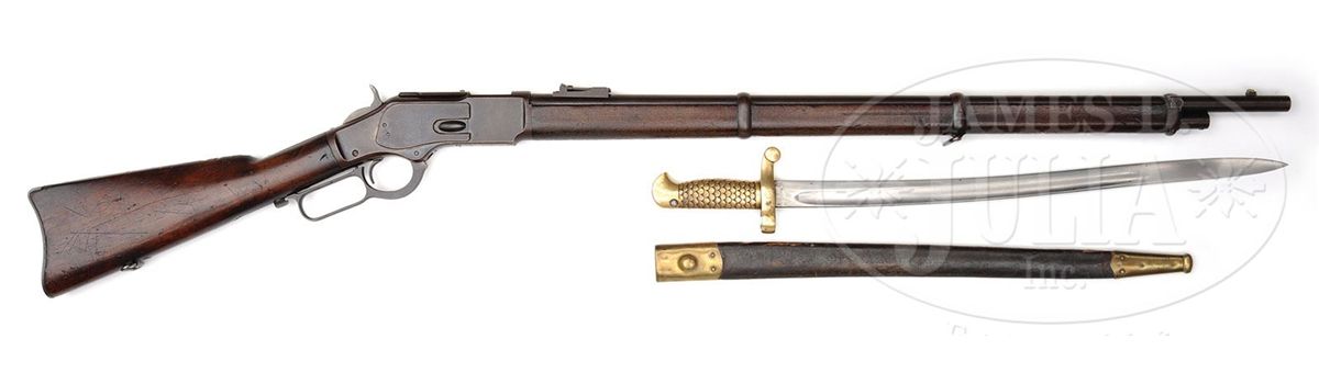 SN 445789. Cal. 44 WCF (44-40). Standard grade musket with 30" rnd bbl, full magazine, square base front sight/socket bayonet lug and 800-yard musket ladder rear sight. Mounted with uncheckered, nicely figured American walnut with full length forearm and straight stock that has carbine/musket buttplate with trap containing a 5-pc brass & iron cleaning rod. Forearm has three bands secured with screws with the upper band having the rare saber bayonet lug. Middle band has a sling loop with corresponding loop in the buttstock. Bottom of carrier is crudely engraved "M. = Kloos". Accompanied by an orig saber bayonet with 20-3/16" Yataghan blade that has brass handle with feathered body & eagle head pommel along with its brass & leather scabbard. Also accompanied by a Cody Firearms Museum letter which identifies this musket in caliber 44 with saber bayonet, received in warehouse Feb. 9, 1893 and shipped next day, no order number indicated. Also accompanied by copies of pp. 172 & 173 of Winchester's New Model of 1873 A Tribute Volume II, Gordon, which pictures the carrier of this musket on p. 172 and right side of the receiver on p. 173, both photos identified by SN. According to The Winchester Book, Madis, Model '73 muskets with saber bayonet lugs are extremely rare, most were equipped for socket bayonets. There were about 721,000 Model 1873 firearms produced and according to the referenced publication only 5% were muskets. Extrapolation of those figures shows that there were only about 36,000 muskets produced and of those, very few were equipped with saber bayonets. CONDITION: Good. Traces of orig finish remain on the receiver, around the sideplates, with the balance of the metal a dark plummy brown patina. Stock has a couple of chips around the wrist, a hairline on each side of the wrist and a series of heavy bruises on the comb, otherwise the wood is sound showing heavy use with nicks & dings and heavy wear on the forearm and retains about 60% original finish on the buttstock and a hand worn patina on the forearm. Mechanics are fine, strong bore with good shine, frosty & dark in the grooves. Bayonet blade has been cleaned with a few small spots of pitting; handle is a cleaned light yellow patina; scabbard has an open seam with light crackling and retains about 80% orig finish; throat & tip have a few small dents. 4-47636 JR225