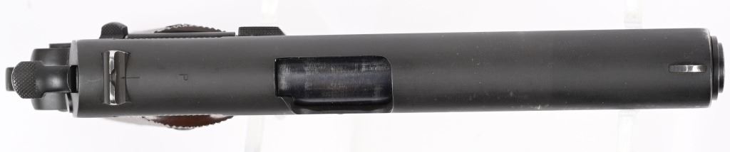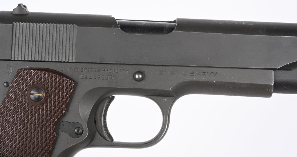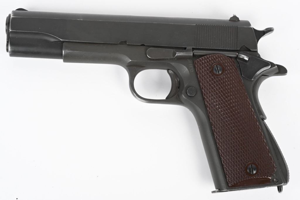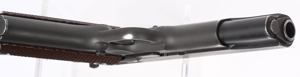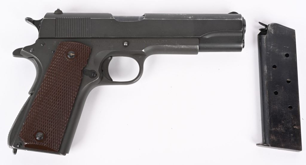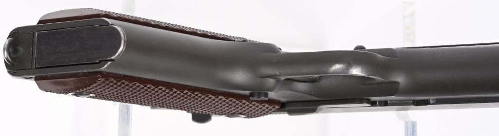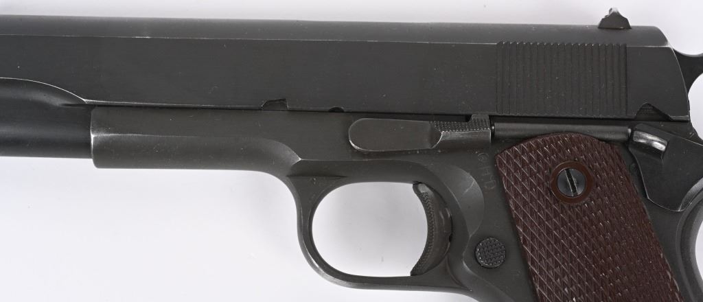 SERIAL NUMBER 1189390 BARREL 5" CALIBER .45 ACP MANUFACTURED 1943. Parkerized finished with brown checkered Keyes pattern grips. Short checkered stamped trigger. wide short checkered hammer. checkered arched mainspring housing. Blue finished barrel marked "COLT 45 AUTO" on lower left side of chamber. GHD inspected on left side with Ordnance wheel inspection on right rear of frame. Frame is (P) proofed below magazine release. Slide is void of marking with exception of (P) firing proof on top forward of rear sight. No (G) or (S) inspections found on top of frame or underside of slide. Magazine is marked (L) on tab (M.S. Little). Pistol remains in original WW2 finish and configuration but without any markings other than (P) proof. CONDITION, Very fine with over 95% finish remaining and slight edge wear. Bore is excellent and bright. Action operates properly. Grips are very fine. C&R