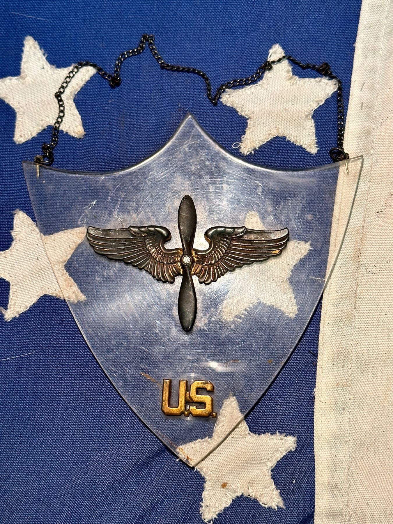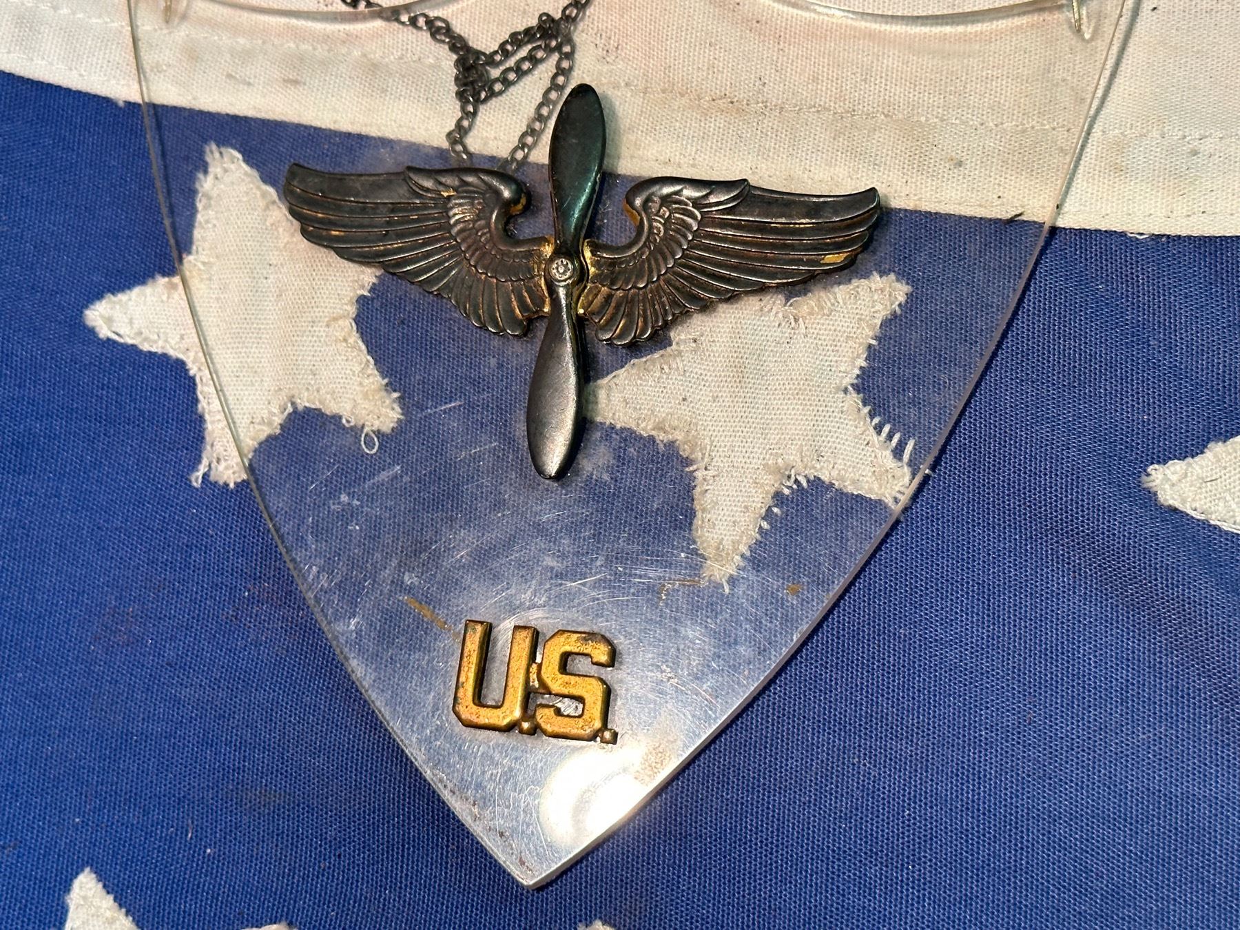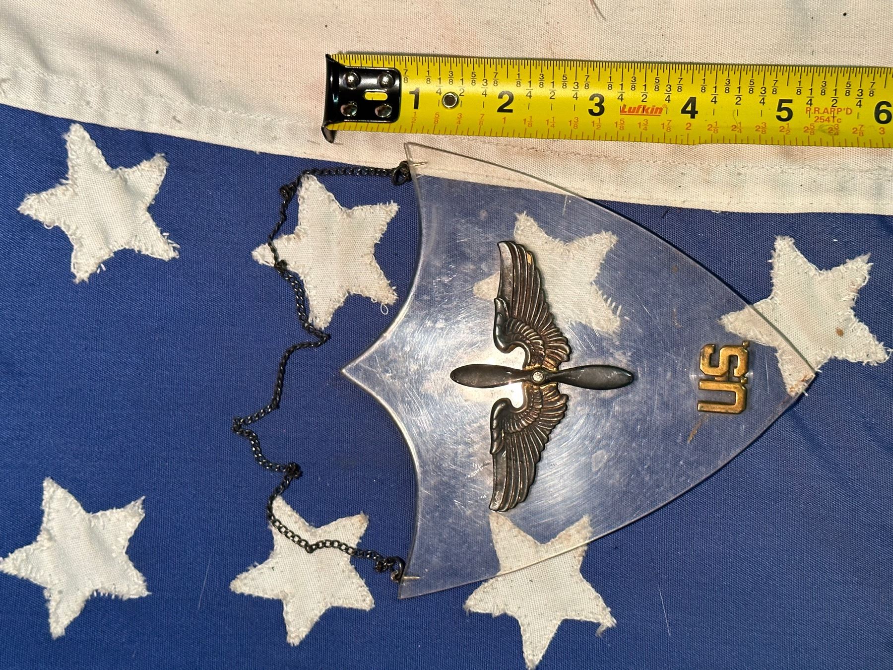 RARE WW2 U.S. AVIATOR PILOTS TRENCH ART WALL HANGER. A RARE FIND. IT IS IN MINT OVERALL SHAPE AND CONDITION WITH A BEAUTIFUL OVERALL PATINA. SHOWS GOOD WEAR AND USE. A GREAT FIND AND AN EXCELLENT ADDITION TO YOUR COLLECTION.