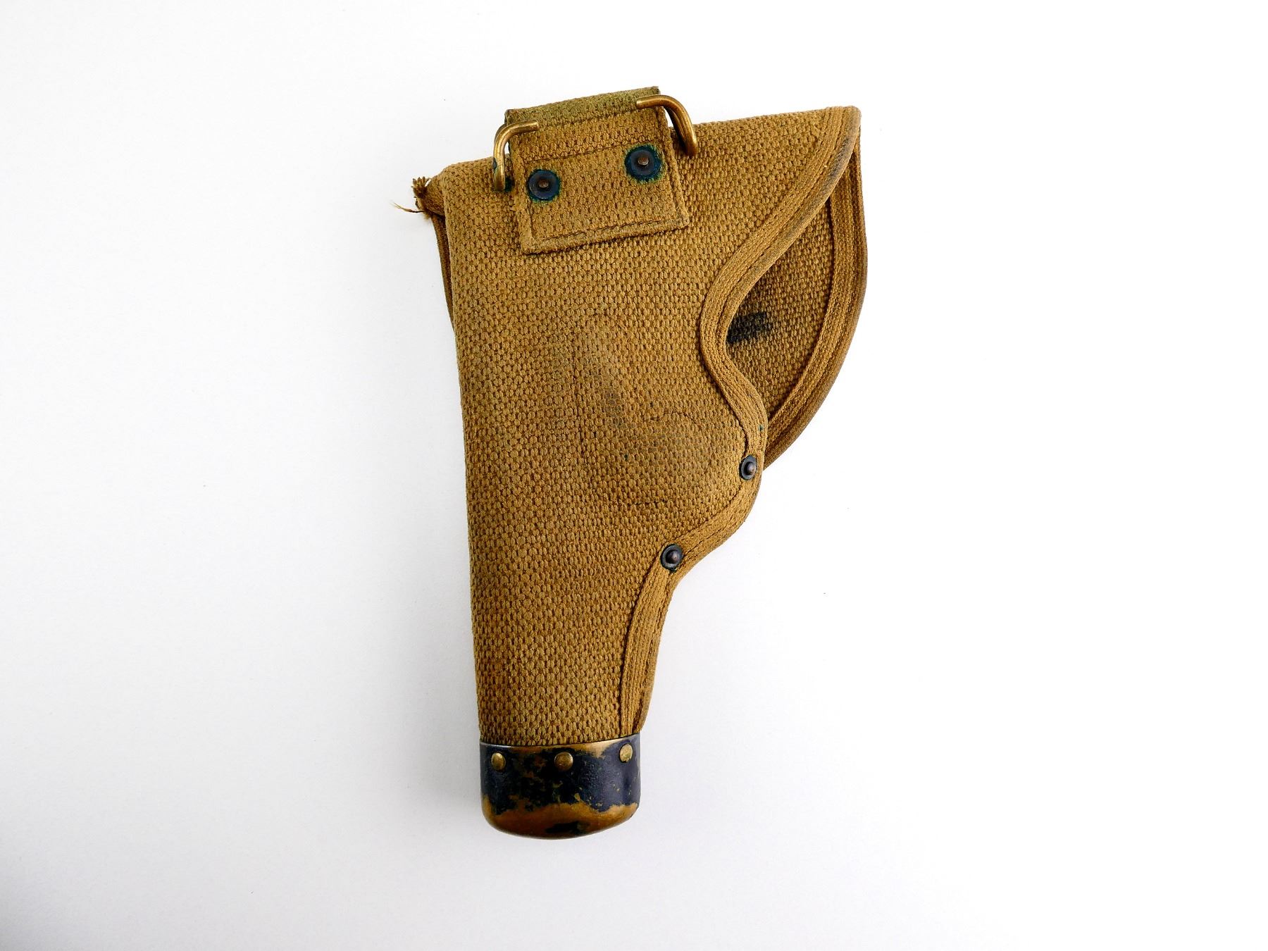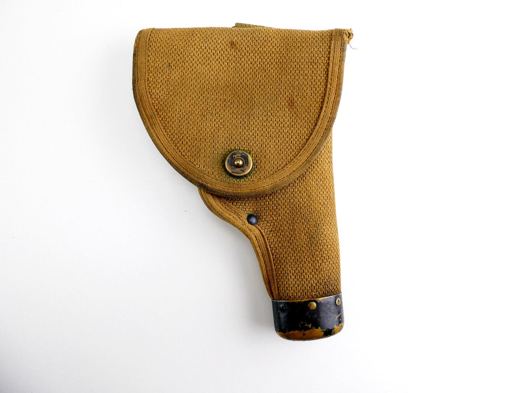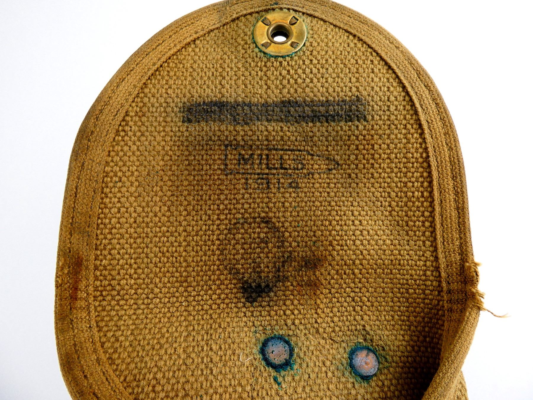 (1) TAN CANVAS WEB HOLSTER WITH BRASS FITTINGS & CAP, WITH BELT HOOK, INSIDE FLAP MARKED: "MILLS, 1914" & C-BROAD ARROW, CAP MARKED: "MILLS", ETC., OAL APPROX. 9", SHOWS AGE / WEAR. SEE PHOTOS.