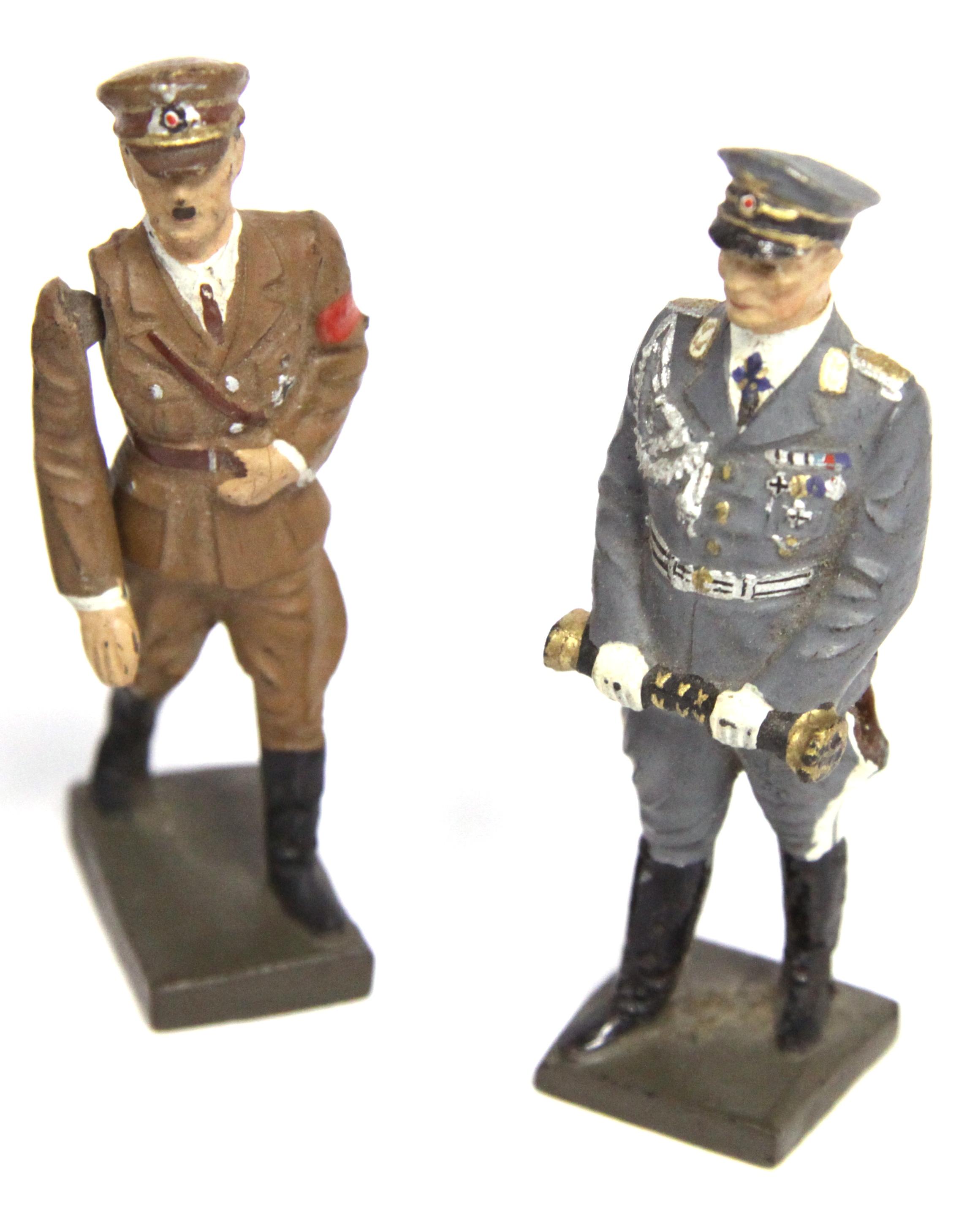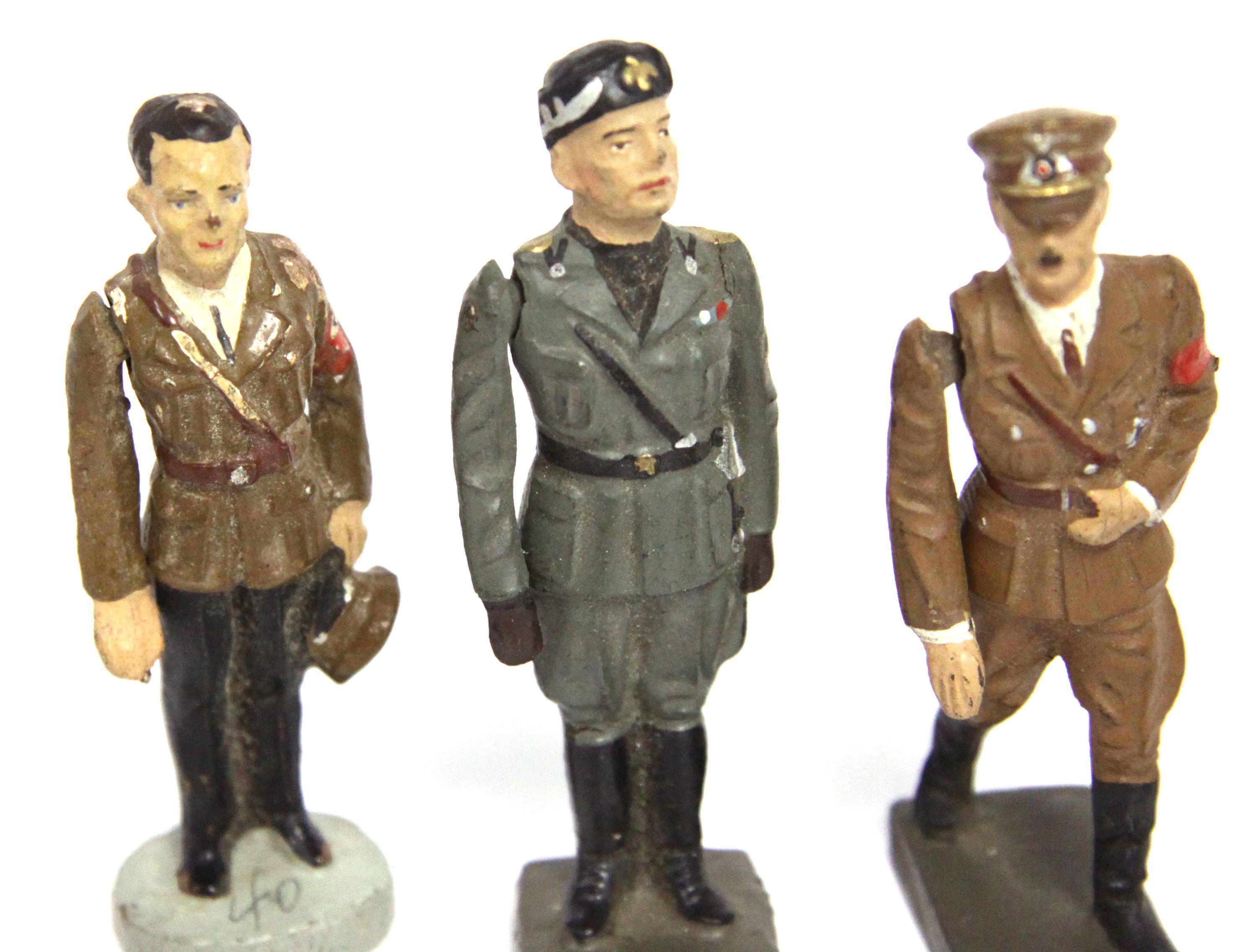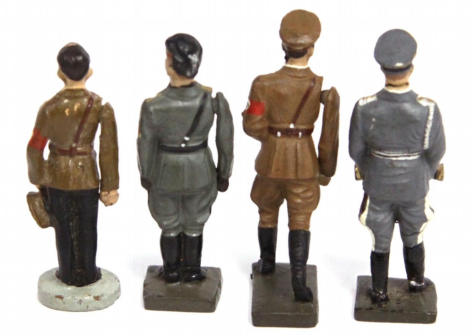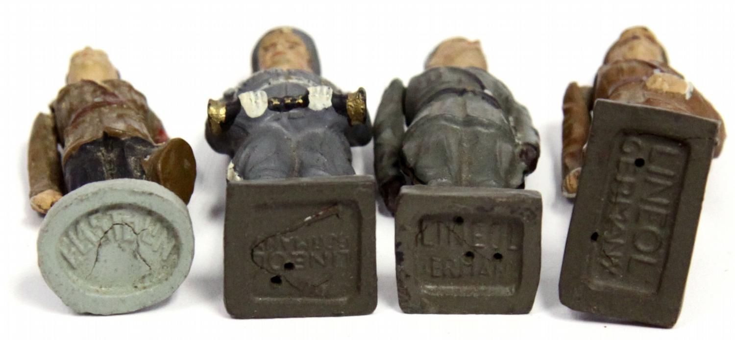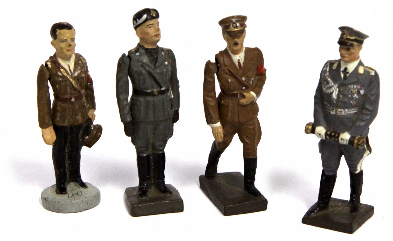 A grouping of 4 rare Lineol and Elastolin composite "toy soldiers". These are the more sought after Nazi leaders. Grouping is as follows: Hiller Lineol in near excellent condition with moving arm, Mussolini near excellent condition also with moving arm, Goering very good condition without dagger, and lastly Hess Elastolin with movable arm some paint loss good. Each figure stands on average 3.5 inches.