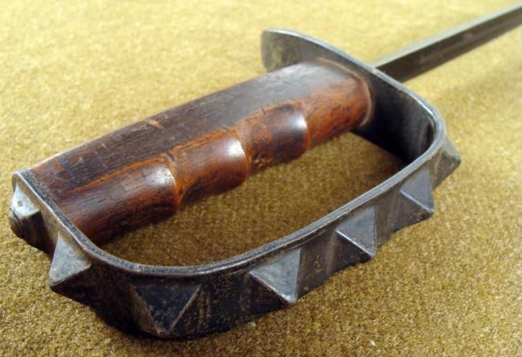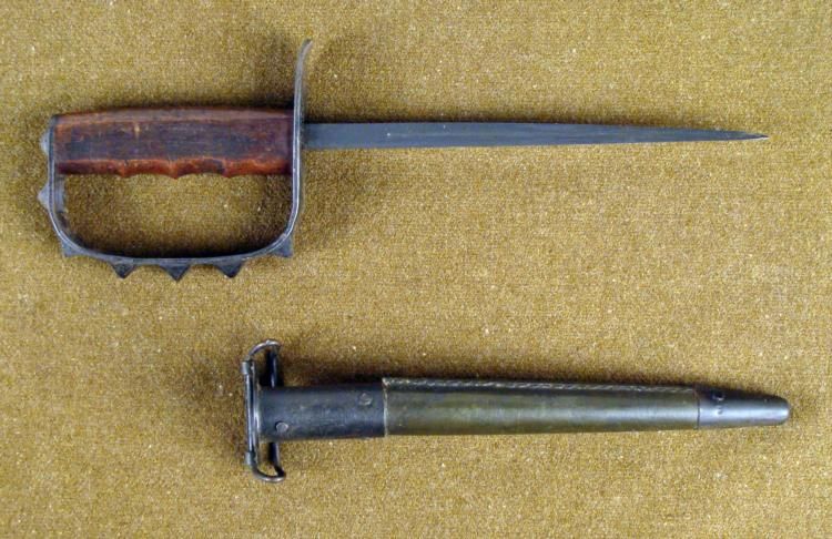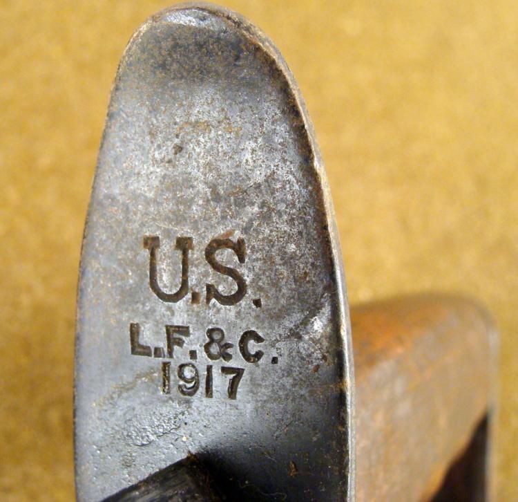 ULTRA-RARE WWI US LF&C 1917 TRENCH KNIFE-TRIANGULAR STILETTO BLADE-NICE LEATHER/METAL SCABBARD * AN OUTSTANDING VERY HARD TO COME BY LF&C WWI US TRENCH COMBAT KNIFE--SOLID WOOD GRIP W/FINGER GROOVES--7 PYRAMID KNUCKLES ON HANDGUARD--UNDERSIDE OF CROSSGUARD IS STAMPED-U.S. LF&C (LANDERS, FRARY & CLARK) 1917---8 3/4" TRIANGULAR STILETTO BLADE-BLUED AND IN FINE CONDITION--SCABBARD IS IN VG CONDITION ALSO--TOP & BOTTOM METAL FITTINGS-TOP FITTING STAMPED "MS".--LEATHER SCABBARD CENTER IS TIGHT AND SOUND--STAMPED "JEWELL 1918"--WWI HAND-TO-HAND TRENCH COMBAT LEGEND. *