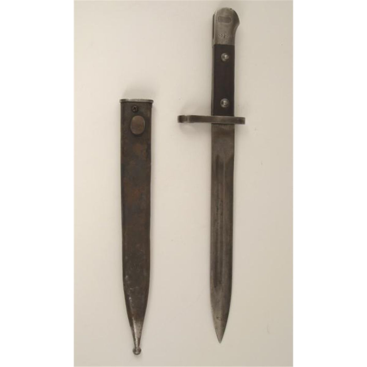 RARE WWII GERMAN/TURKISH "AS FA" MAUSER RIFLE BAYONET-CLEAN-#'D W/SCABBARD * NICE 9 3/4" FULLERED BLADE CROSSGUARD WITH BARREL HOLE-DARK WOOD RIVETED GRIPS--EAGLE HEAD POMMEL WITH WORKING RELEASE BUTTON0MARKED "AS FA" (TURKISH ARMS) SERIAL #140465--O/A LENGTH 16" *
