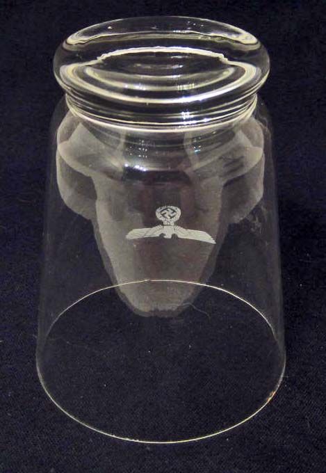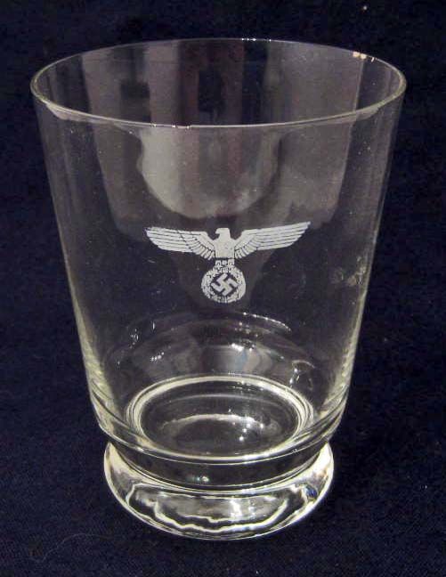 Features an etched Nazi eagle and swastica symbol on the side. Measures approx 3-7/8" tall and 3" in diameter around the rim. There are some very slight chips in the rim of the glass.