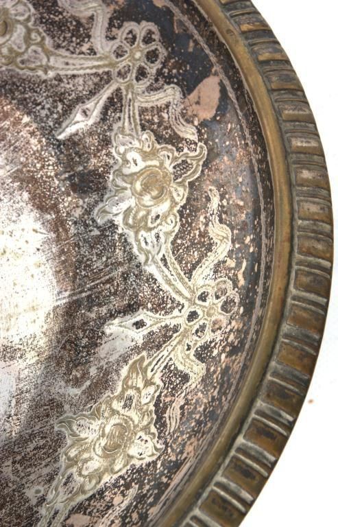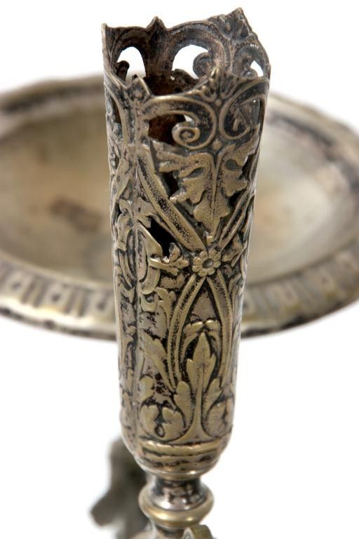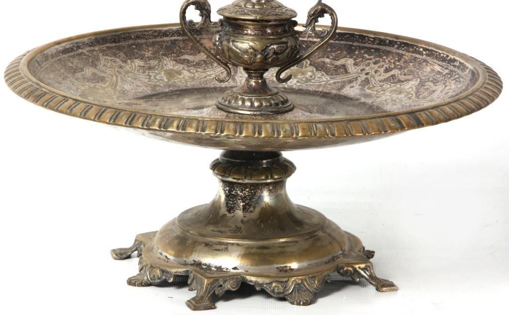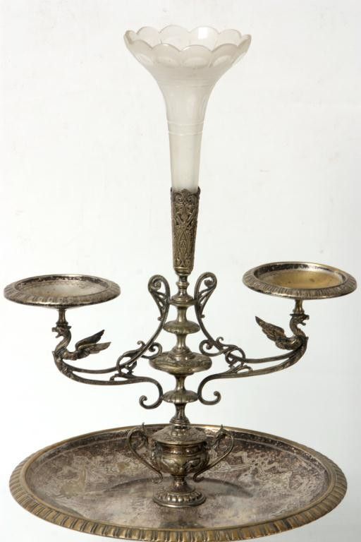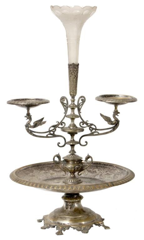A very nice Victorian epergne. 22.5 " tall. Some plate wear. Opaque white glass flower holder. Detailed etchings