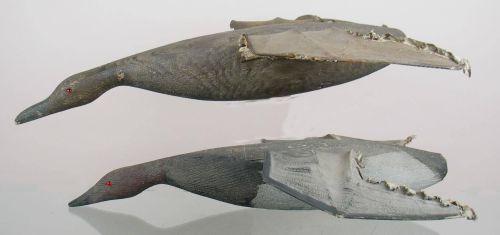 RARE pair of Tuveson Company flying canvasback decoys. Tuveson manufactured decoys from 1919 to 1942. The patent for the flying models was issued in 1927. The drake retains the original brass label on the bottom. Both are in OP with some overall light wear, glass eyes and canvas wings stretched over a wire frame. Canvas is in good condition. Hen has an original body check on the right side with the filler cracked with some missing.