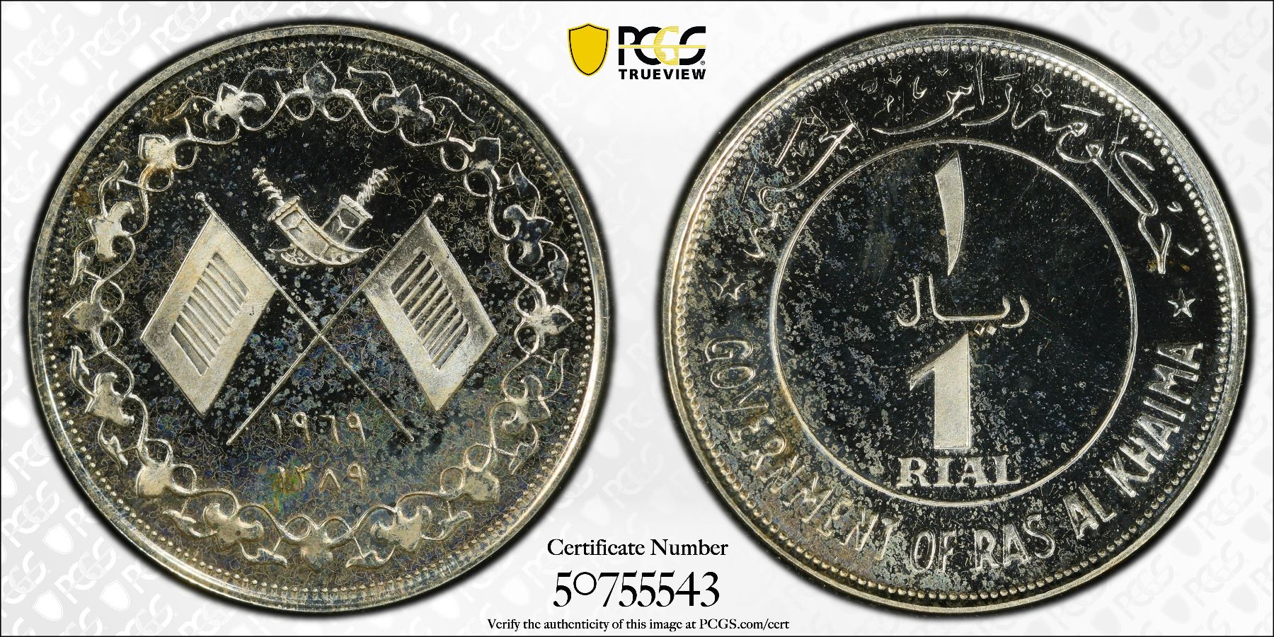 RAS AL KHAIMA: Saqr bin Mohammed Al Qasimi, 1948-2010, AR rial, 1969/AH1389, PCGS Proof 66 CAM