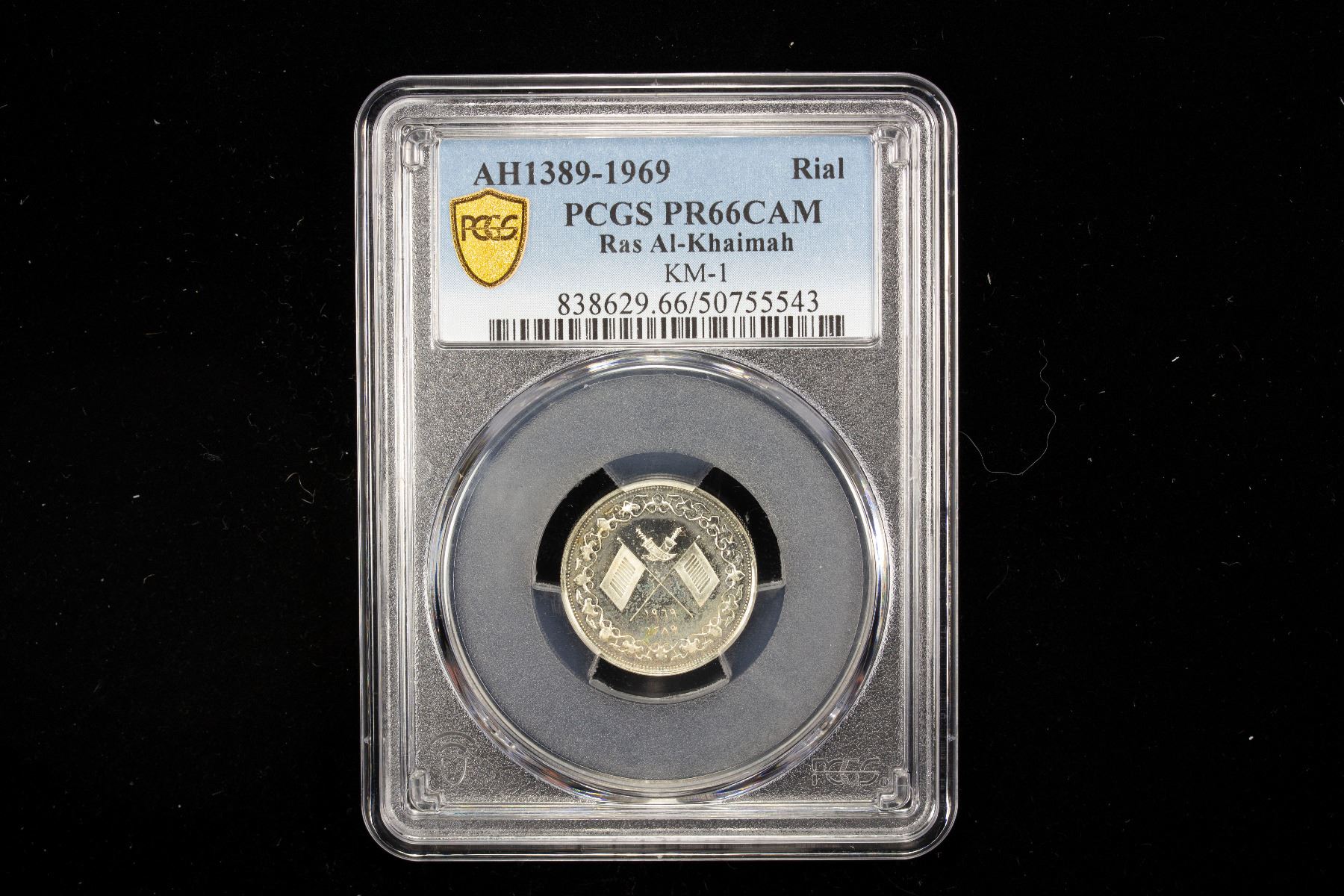 RAS AL KHAIMA: Saqr bin Mohammed Al Qasimi, 1948-2010, AR rial, 1969/AH1389, KM-1, a fantastic reflective proof example! PCGS graded Proof 66 CAM.