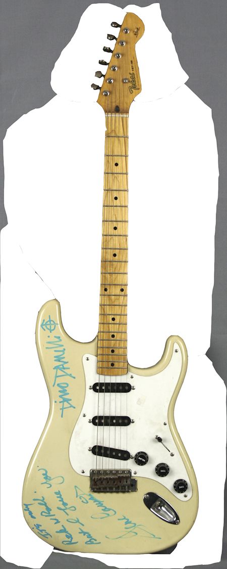 This Tokai Stratocaster style guitar was played by Gene Cornish, original guitarist for the blue-eyed soul supergroup during a New York City guest appearance in the 1980's. Cornish, who was inducted into the Rock & Roll Hall of Fame in 1997, has signed the body of the guitar in bold turquoise marker "Its Only Rock n Roll...But I Love You" while Rascals drummer Dino Danelli has signed as well, adding a bit of artwork.
