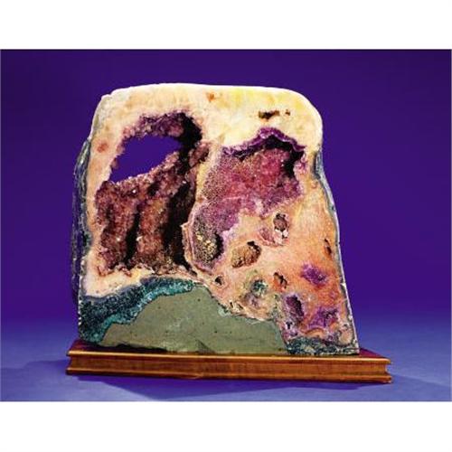 <B>RASPBERRY AMETHYST "VUG" </B></I><BR> <I>Rodeo Binito, 20 miles east of Fredrico<BR>Westphalen, Rio Grande do Sul, Brazil </B></I><BR>Almost all of the amethyst "geodes" from the Brazil-Uruguay border feature varying amounts of amethyst and agate with an occasional selenite or calcite in the interior. This particular geode contains a normal layer of light purple amethyst which has been over-coated with bright druzy crystals of rose quartz, giving this uncommon specimen a rich raspberry- colored interior. This specimen represents a thick center slice of the original geode measuring 17 x 13 x 5 inches thick and can be displayed on either side.<BR><BR><b>Shipping:</b> Requires 3rd Party Shipping (<a target="_blank" href="http://www.heritageauctions.com/common/shipping.php">view shipping information</a>)