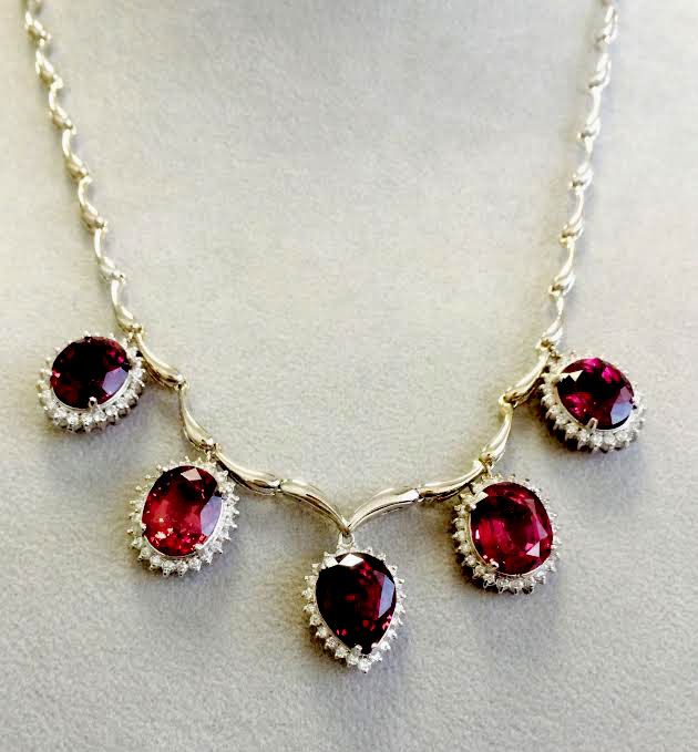 RASPBERRY GARNET 28.29CT, 14K W/G NECKLACE 21.14GRAM / DIAMOND 1.61CT