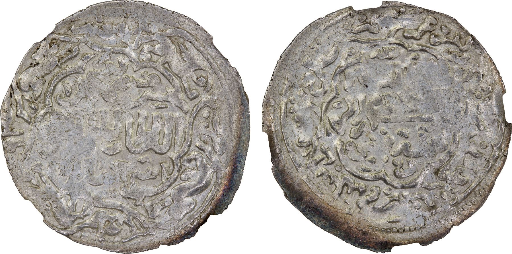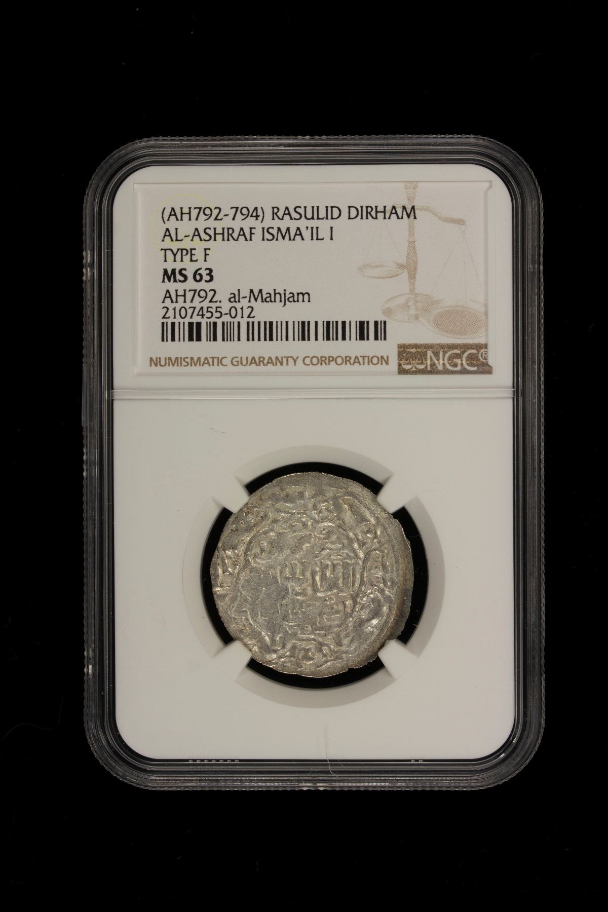 RASULID: al-Ashraf Isma'il I, 1376-1400, AR dirham, al-Mahjam, AH792, A-1110.6, type F, four lions, a lovely mint state example! NGC graded MS63. The pictorial devices are repeated four times in the margin (eight times at 'Adan): fish at 'Adan, hawk, lion, hare or hawk type al Mahjam, seated man at both Ta'izz and Zabid. Coins of this and all successive types are struck on very broad and thin planchets.